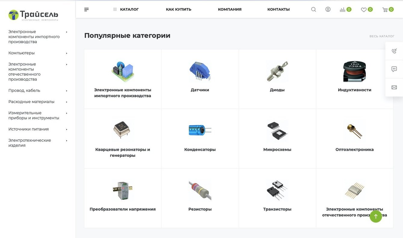 Компания Трайсель занимается поставкой электронных компонентов и радиодеталях по России и специализируется на оптовой и розничной продажах. У компании уже был сайт, но он уже не отвечал современным требованиям онлай торговли, на нем было сложно что либо найти, а об оплате не могло быть и речи. В добавок к всему большой каталог нуждался в своевременном обновлении цен, а делать обновление в ручном режиме было невозможно