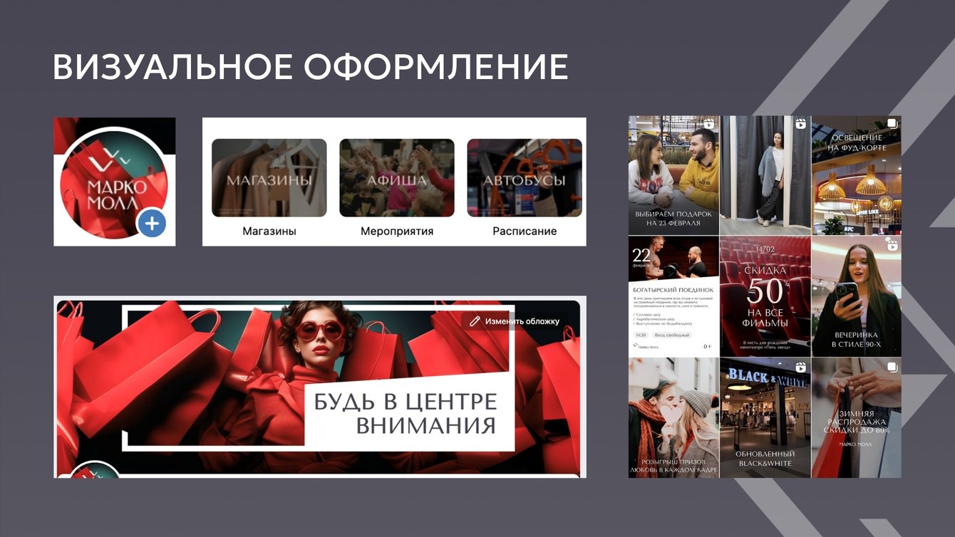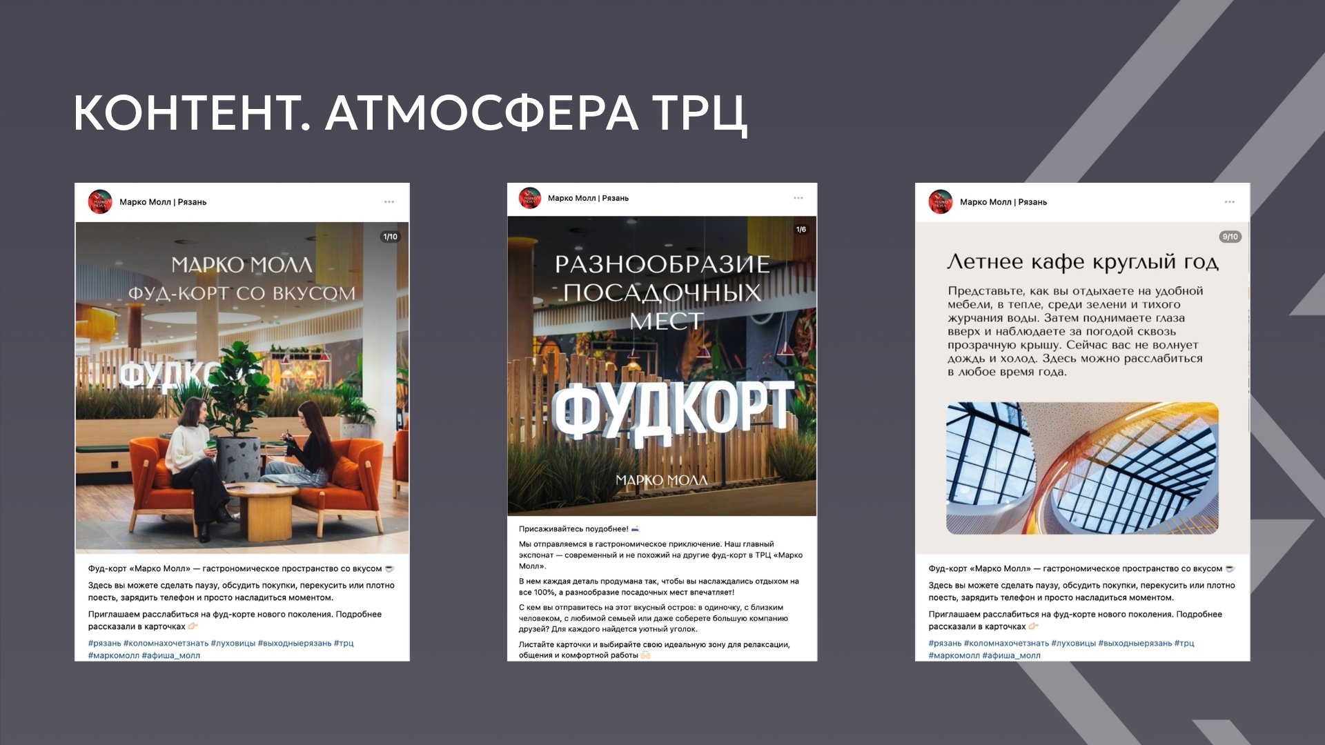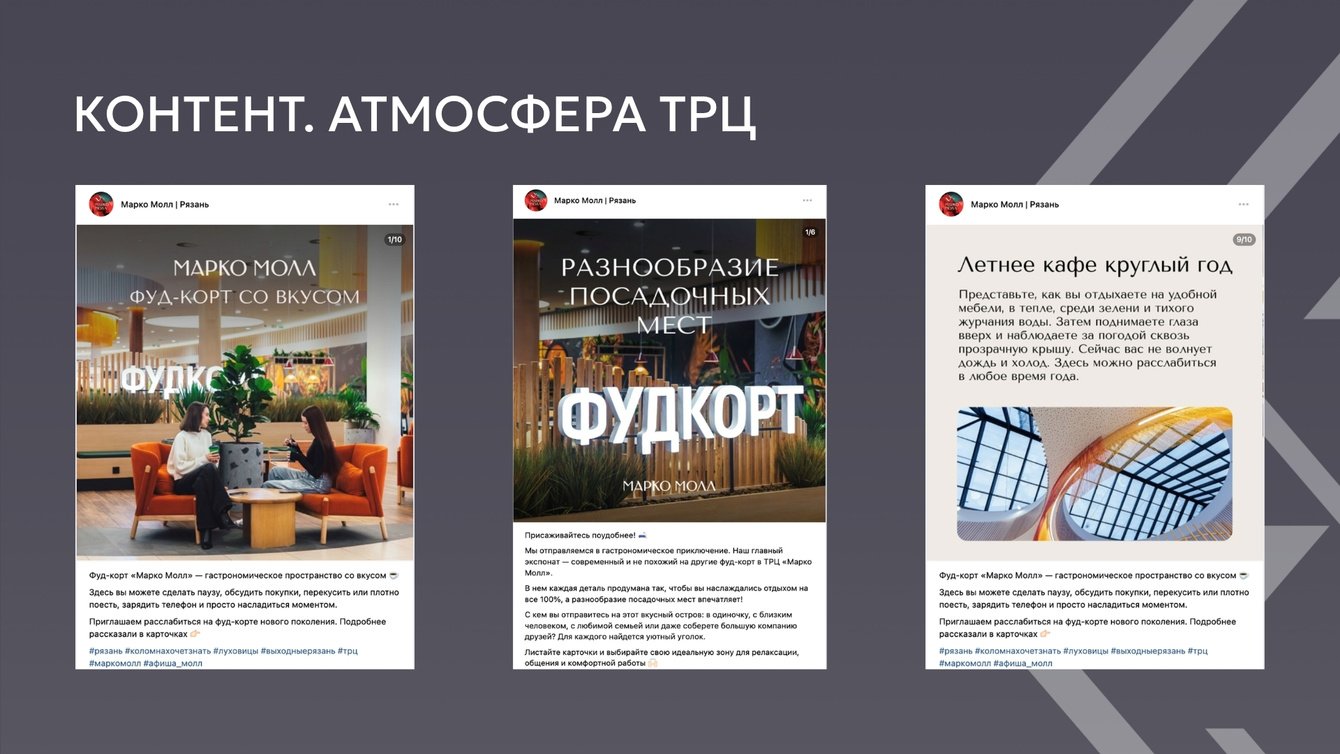 В публикациях мы доносим до пользователей, почему новые сервисы ТРЦ удобны и важны. Наша подача в соцсетях помогает людям заранее представить, как они проведут время в торговом центре, ощутить атмосферу и увидеть пользу для себя. Так мы формируем полноценный пользовательский опыт еще до визита в ТРЦ, делая его более осознанным, комфортным и ожидаемо приятным.