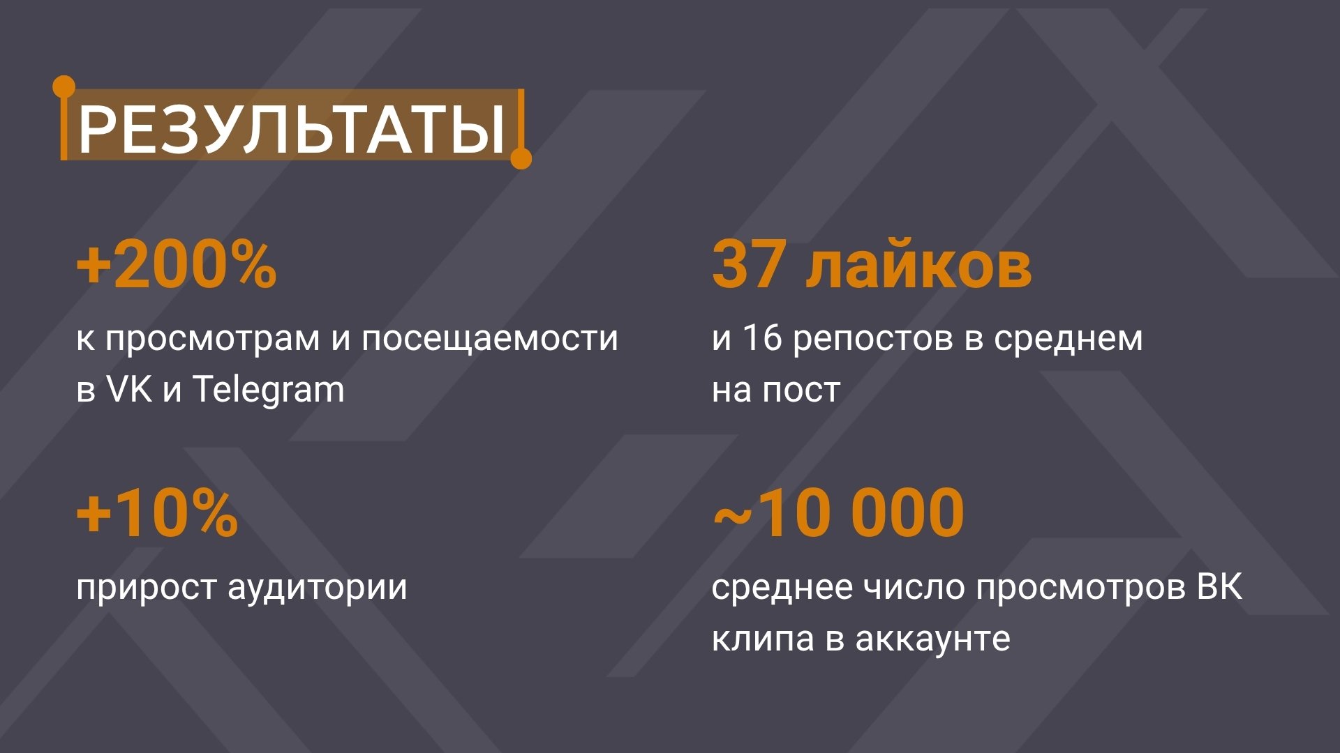 За год работы благодаря грамотной SMM-стратегии нам удалось добиться прироста аудитории ( октябрь 2024г. - сентябрь 2025г.) на 10%, а также почти на 200% увеличить просмотры и посещаемость сообщества во ВКонтакте и Телеграм-канале. В аккаунте получилось собрать активную аудиторию: посты в среднем набирают 37 лайков, 16 репостов и 10 комментариев, а среднее количество просмотров клипа — около 10 тысяч.