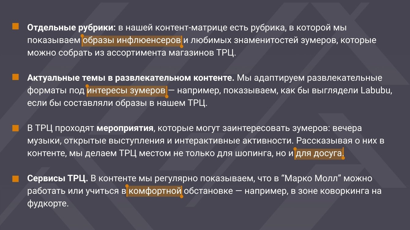 Одна из ключевых задач стратегии – поделиться с аудиторией философией "Марко Молл" и показать, как обстановка ТРЦ продумана для удобства посетителей. Для этого мы разработали отдельную рубрику контент-матрицы, благодаря которой гости знают, что в ТРЦ можно оставить одежду в гардеробе, на фуд-корте играет музыка, подобранная под биоритмы человека, для молодых мам открыта комната матери и ребенка, а дети могут повеселиться в плейхабе.