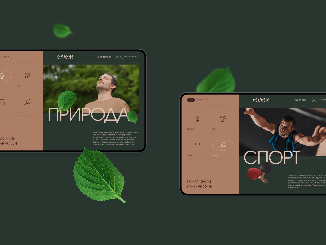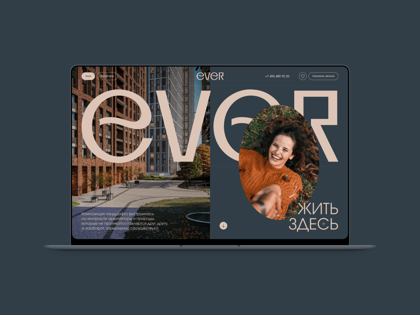 Ключевой концепт EVER — гармония между городским шиком и природной безмятежностью. Сайт должен доносить его и с помощью последовательной аргументации, и на эмоциональном уровне. Если пользователь почувствует слияние комфорта, красоты, современности и природы, то эти же ценности для него приобретет сам продукт — ЖК EVER.