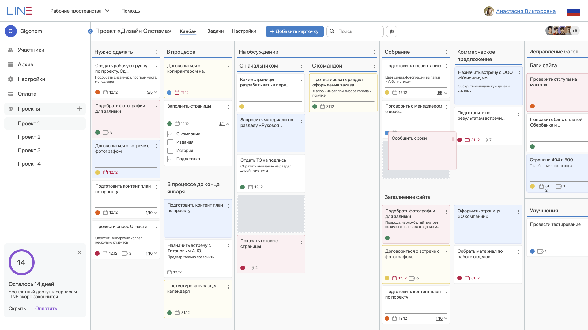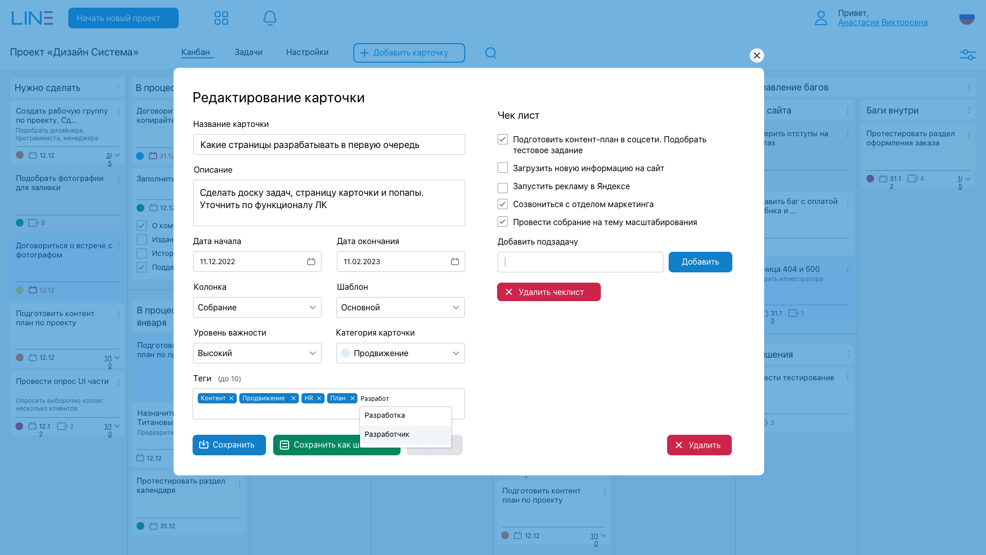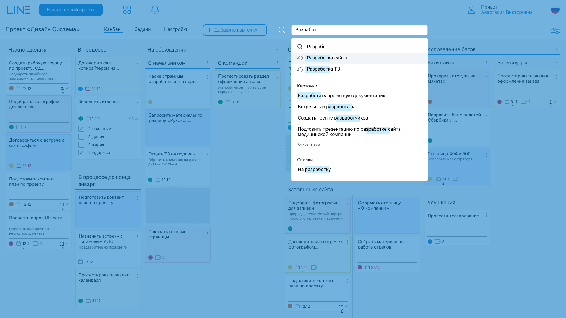- Канбан-интерфейс с возможностью гибкой настройки списков и карточек