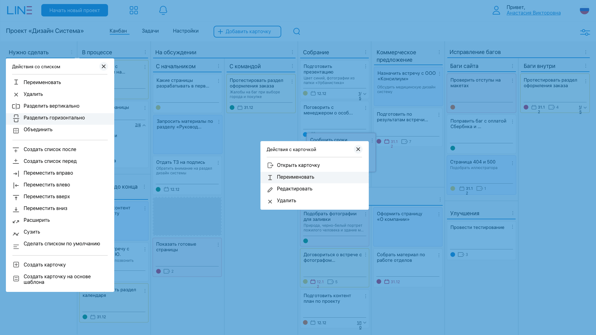 - Быстрые действия с карточками и списками (редактировать, переместить, объединить, шаблон)