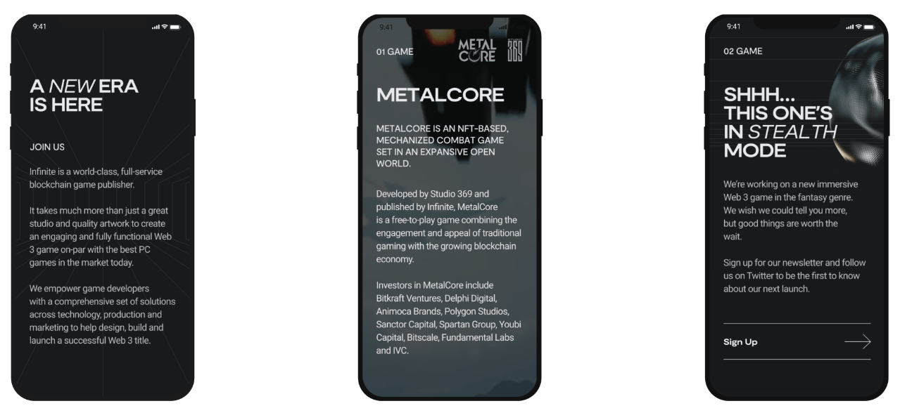 Сайт должен был продемонстрировать опыт Infinite Games в разработке игр, особенно в контексте их NFT-игры Metalcore; создать представление об игровом процессе Metalcore и дорожной карте проекта.