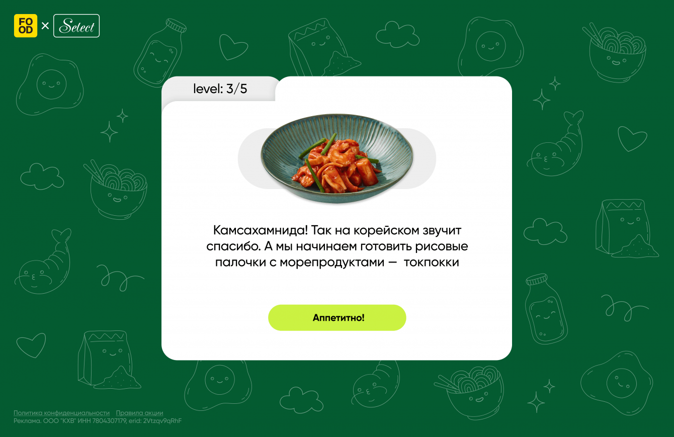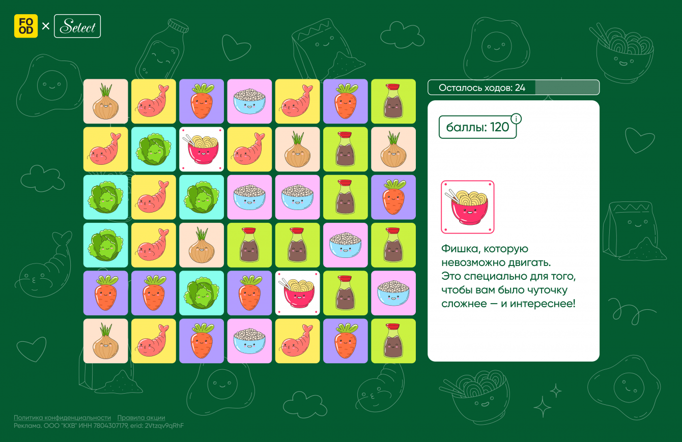 Для достижения поставленных задач команда нашла оптимальное решение: разработать спецпроект по мотивам известной игры «Три в ряд». Таким образом Food.ru выпустил увлекательную игру, посвященную запуску новой линейке «Корейские блюда». Стоит отметить, что в основе проекта лежит простая и знакомая многим игровая механика, которая одновременно формирует лояльность аудитории к новой продуктовой линейке и выполняет развлекательную функцию.