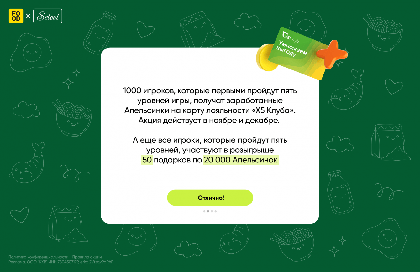 Благодаря игре пользователи увлекательно проводили время и выигрывали призы. Первая тысяча игроков, которые прошли все пять уровней, получила до 2 тысяч Апельсинок на карту «Х5 Клуба». Таких периодов было три: в каждом из них игра обновлялась, поэтому у участников было несколько возможностей испытать удачу и войти в первую тысячу, чтобы заработать баллы. Такая механика позволяла поддерживать интерес игроков и мотивировала их заходить на лендинг чаще.