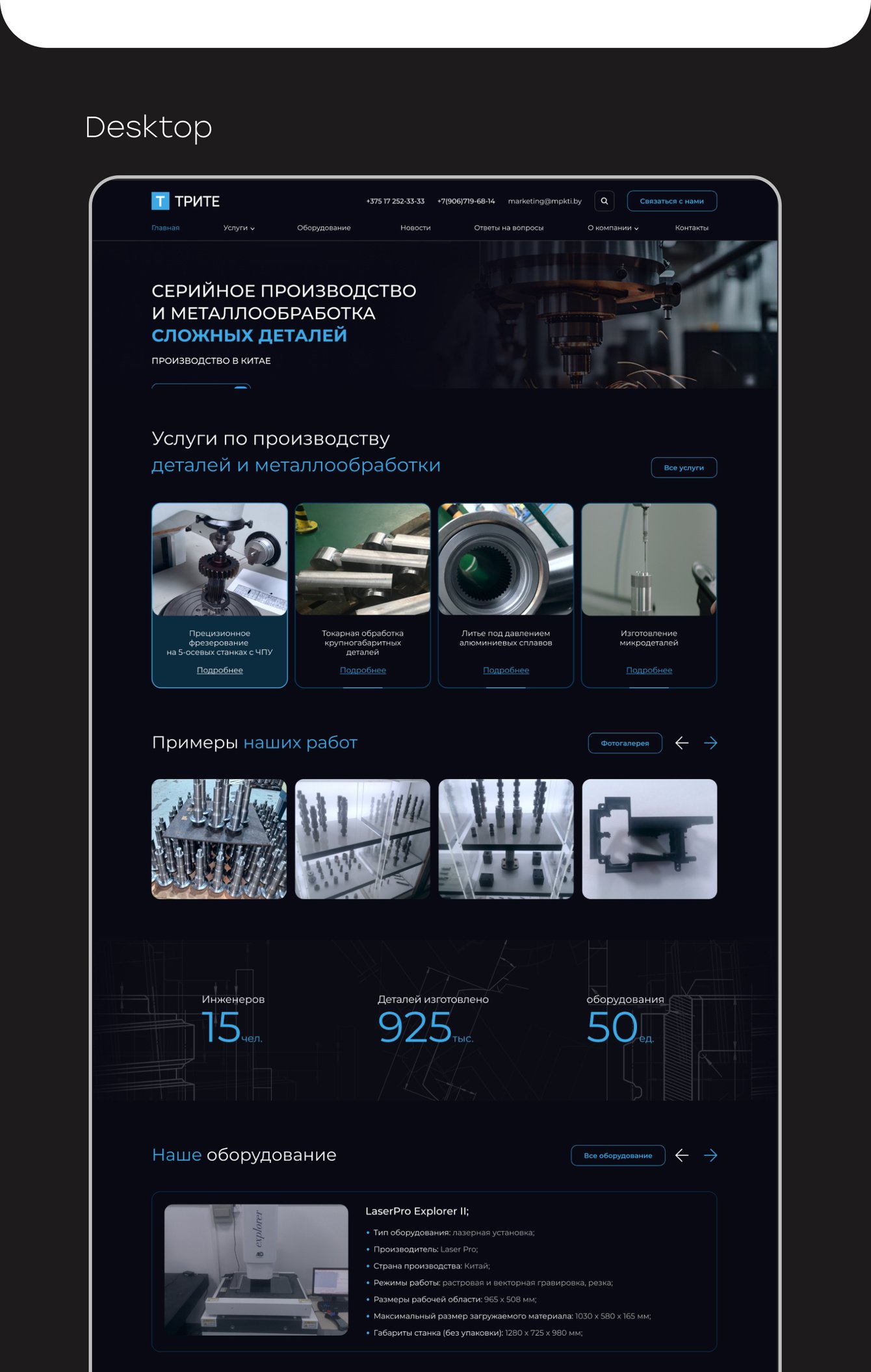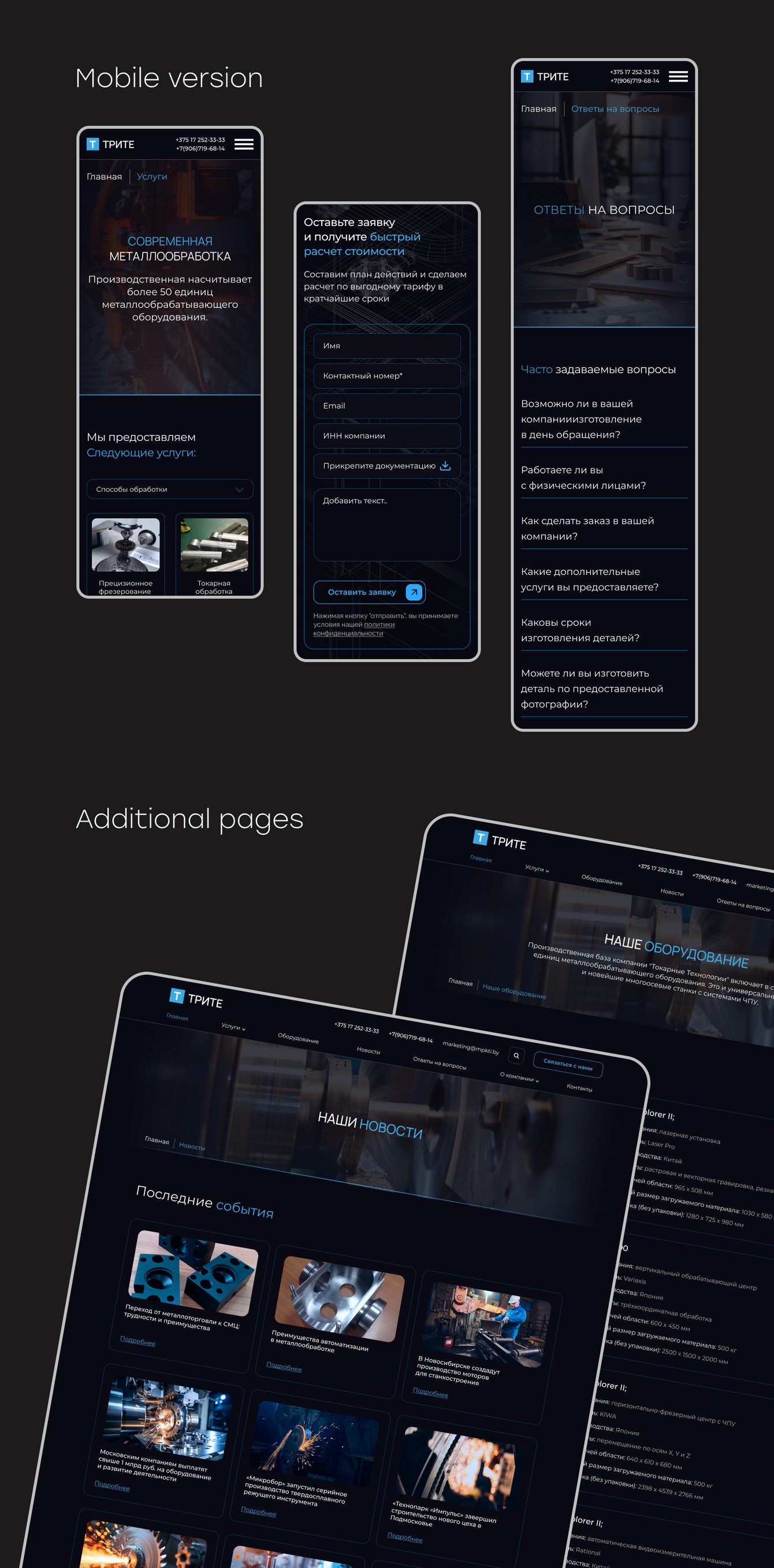 Разработали дизайн, но после показа заказчику, пришлось полностью переделать, так как заказчик по итогу захотел в темном цвете дизайн, чтобы выглядел сайт более дорогим и презентабельным. Мы переработали полностью стиль дизайна и согласовали новые макеты с заказчиком. После передали на html верстку и приступили к разработке на WordPress. Разработали различный функционал с возможностью выкладывать работы, оборудование, категории услуг и услуги. По согласованию с заказчиком сделали видео инструкцию и перенесли на хостинг к заказчику, добавили метрику, вебмастер, google search console, sitemap, проверили скорость загрузки, которая составляла на ПК 100, на мобильных 90+