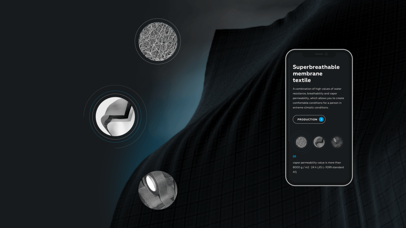 Для наглядного объяснения основных свойств материала: ветроустойчивости, влагоотталкивания, свойства «дышать» (пропускать воздух и удерживать тепло), мы сделали ряд 3D-моделей.