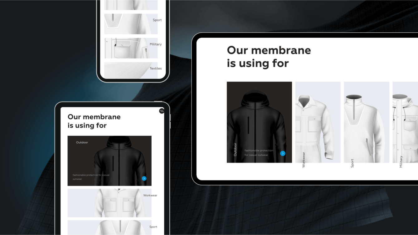 Посетители сайта — производители одежды и обуви для профессиональных спортсменов, альпинистов, рабочей и военной формы. Поэтому вместо конкретных фотографий продукции с применением наноматериала, мы используем унифицированные изображения, которые потенциальный партнер может переложить на свои товары.