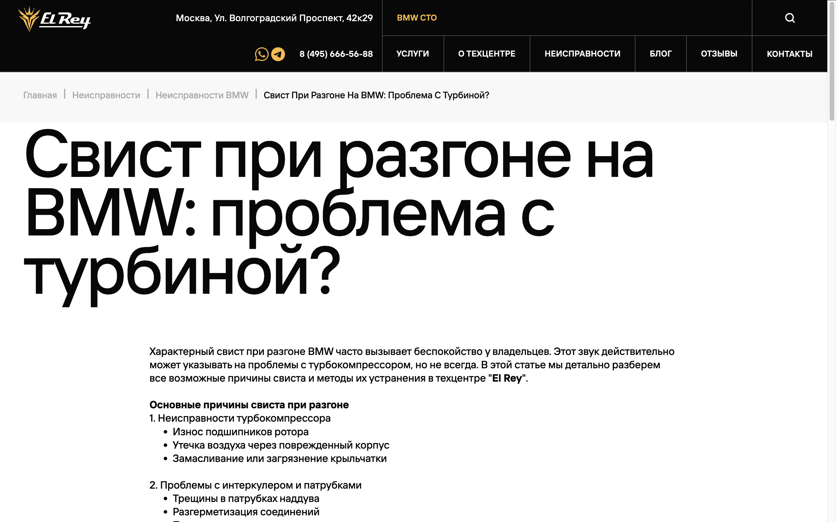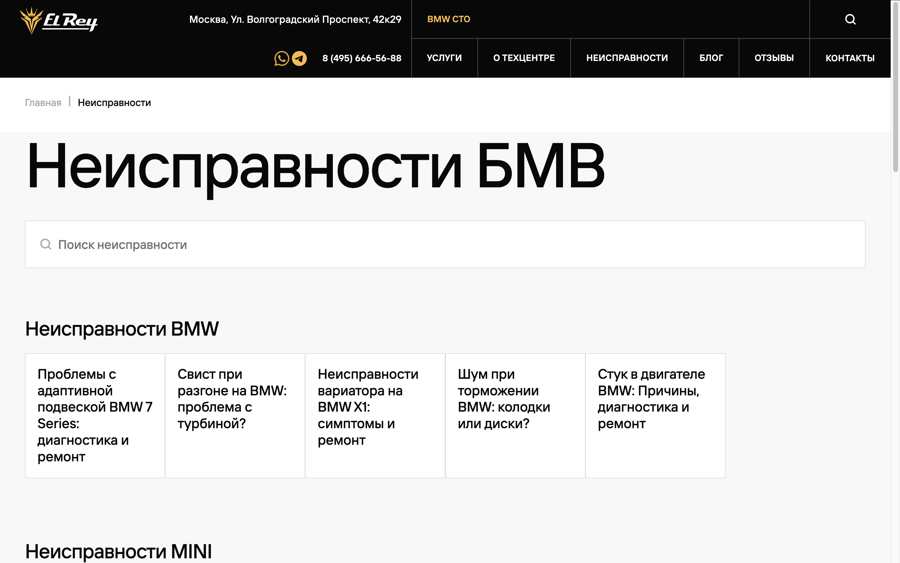 На основании данных SEO аудита мы разработали раздел “Неисправности”. В нём размещены популярные статьи по неисправностям брендов BMW, MINI и Rolls-Royce. Для удобства пользования мы реализовали удобный поиск по ключевым словам.