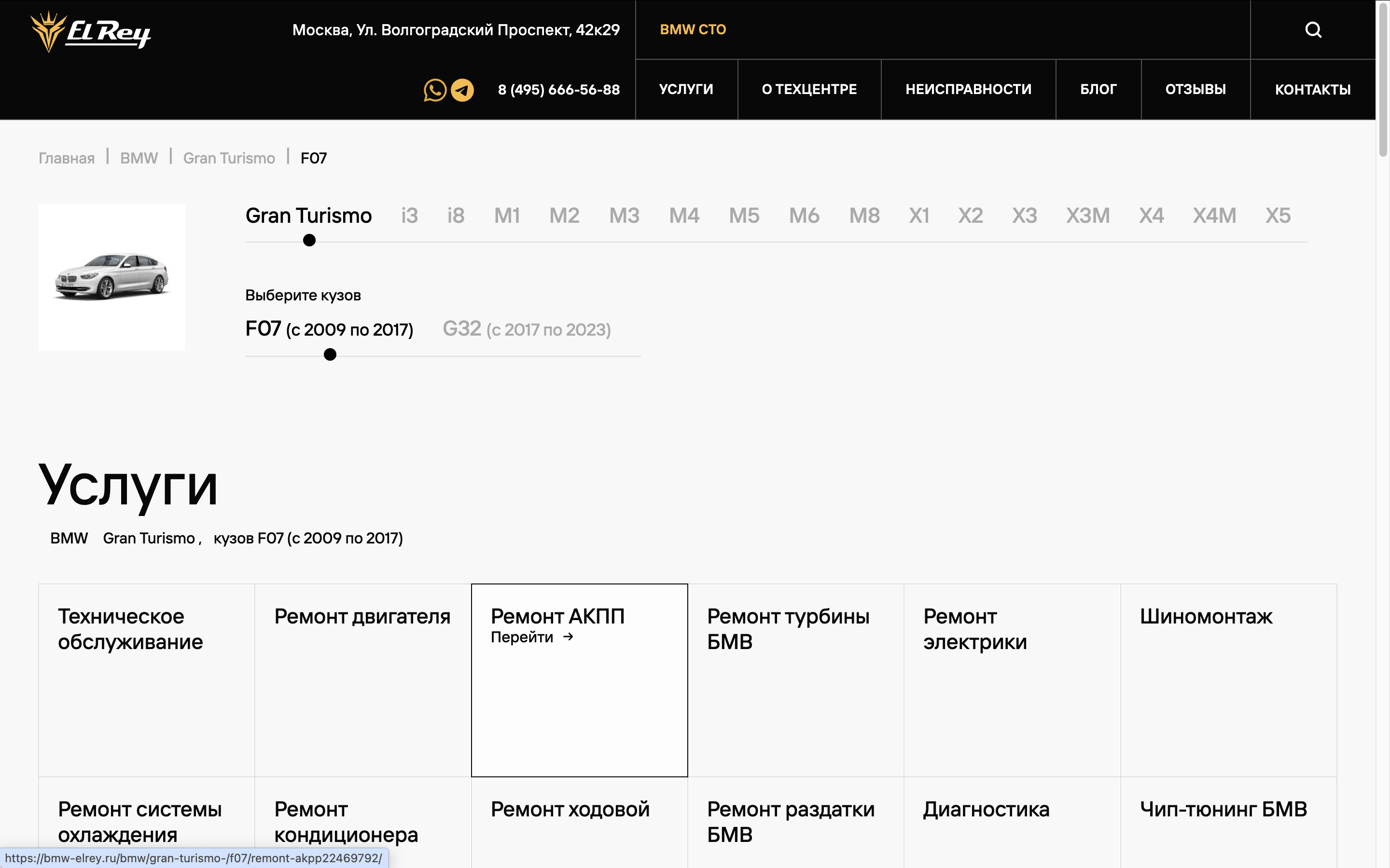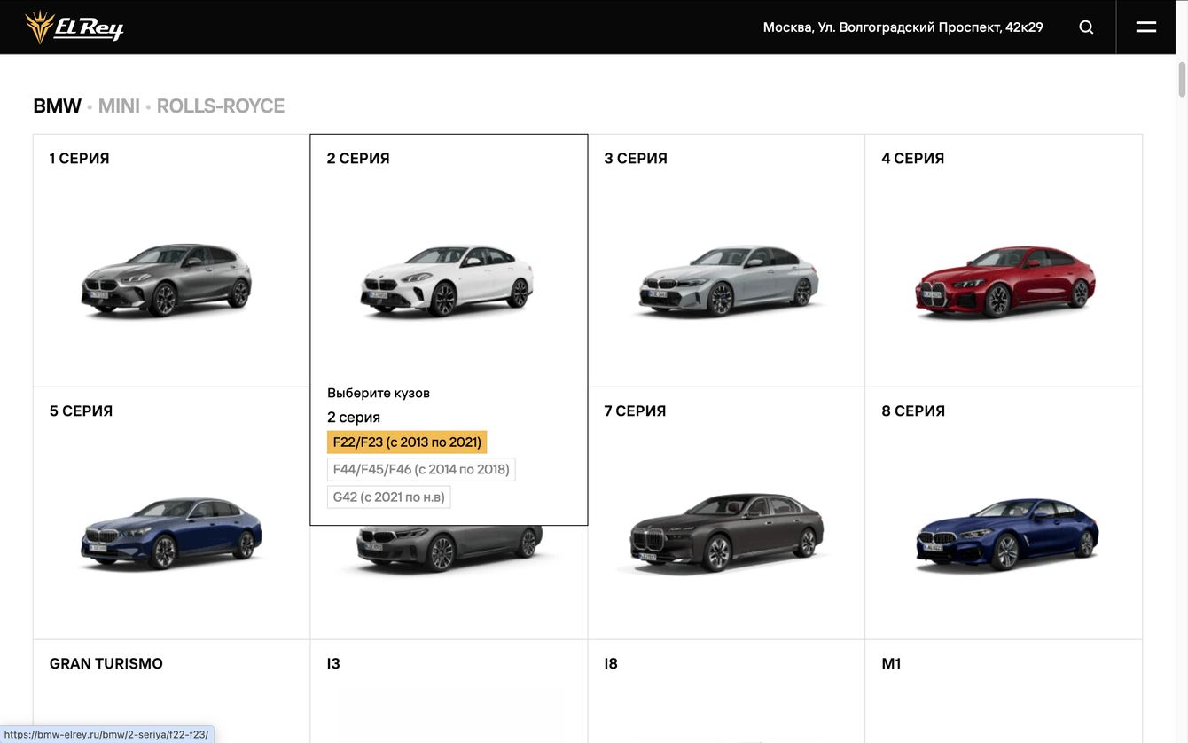 Далее мы разместили каталог услуг. Мы хотели, чтобы клиент мог быстро найти услуги по его автомобилю и не терялся в огромных списках. Для этого разработали сетку с карточками серий и кузовов, а при клике на кузов пользователь уже попадал в раздел с услугами конкретного автомобиля. Такой подход превратил каталог в лёгкий и понятный навигатор, который делает путь клиента к информации максимально коротким.