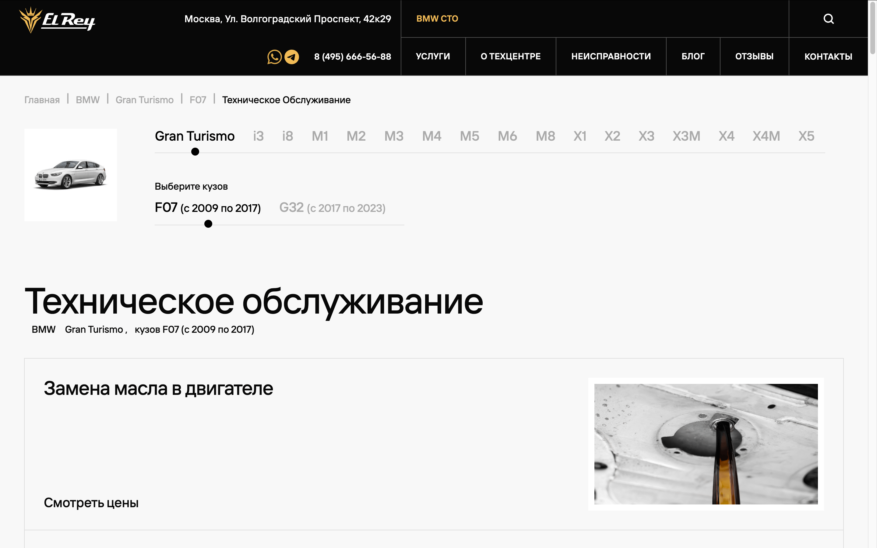 В разделе услуг мы сделали двухуровневый выбор — сначала серия, потом кузов — чтобы повторить привычную логику владельцев и быстро вести их к нужным услугам. При выборе этих опций на странице обновлялся информация по услугам. Далее пользователь выбирает конкретную услугу.