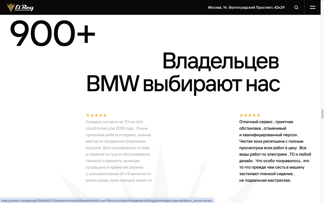 Когда мы добрались до блока с отзывами и причинами выбрать сервис, мы понимали: этот раздел должен работать как “момент истины” для потенциального клиента. Он уже увидел услуги, узнал о возможностях техцентра, но именно здесь решает — доверять или нет. А как можно доказать доверение? Только реальными отзывами и ссылкой на Яндекс.Карты. Мы не стали добавлять в отзывы фотографии, чтобы было меньше визуального шума, а пользователь сфокусировался на эмоции от самого отзыва.