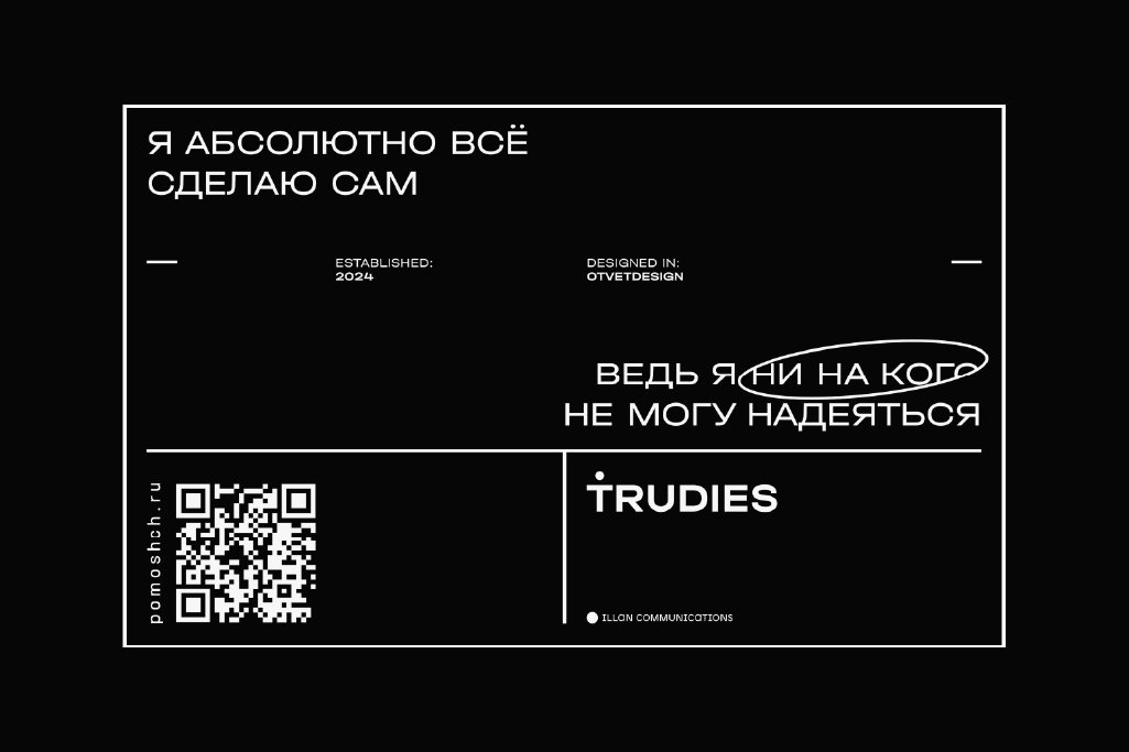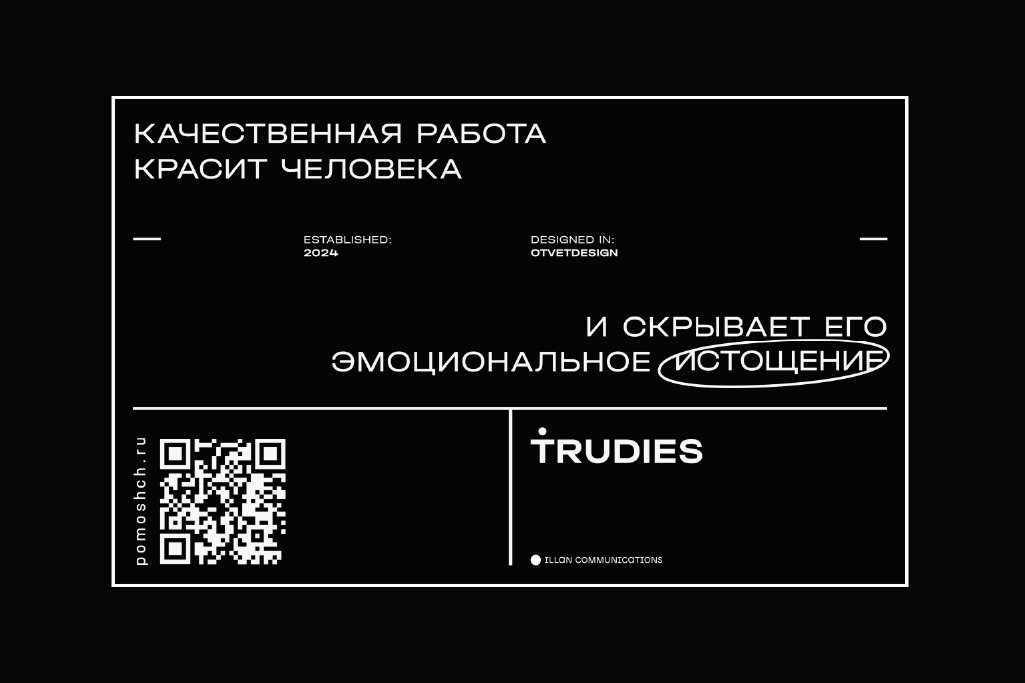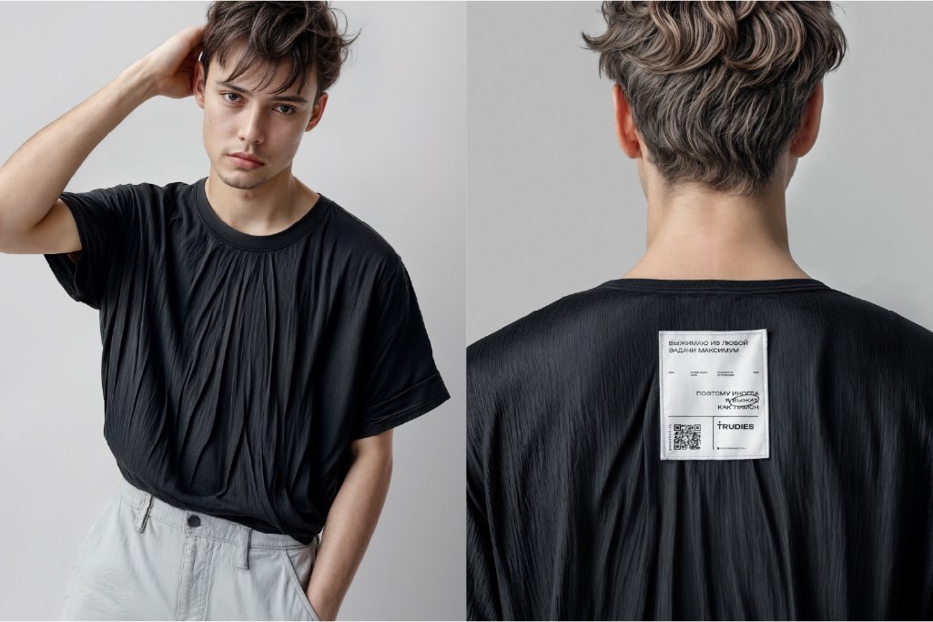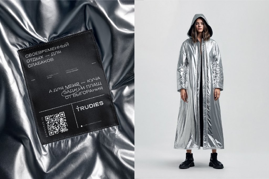 Для коллекции было создано название-неологизм, отражающее саму её идею: TRUDIES. Ключевой визуальной метафорой фирменного стал сам трудоголик: человек, буквально приколоченный к рабочему месту. Решением стали нестандартные форм-факторы, через которые мы намерено гиперболизировали атрибуты деструктивных отношений с работой. Например, свитшот со множеством рукавов, ассиметричная футболка как символ work-life дисбаланса, плащ из огнеупорного материала как метафора выгорания. Каждый предмет — отражение нездоровой продуктивности: от скрывающих недосып очков до сжимающей в тисках трудоголизма панамы.