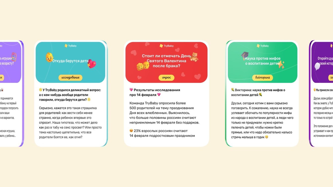 В 2022 году мы запустили мобильное приложение в категории ParentTech «TryBaby — первый прикорм». И оно настолько полюбилось российским мамам, что к концу прошлого 2023 года уже преодолело отметку в 58 000 пользователей. А дополнительный инструмент коммуникации, чат родителей в Телеграм, привлек за 2023 год более 3 000 родителей, продолжая расти сейчас. Напомним, что основная функция приложения состояла в визуализации современных рекомендаций по прикорму из открытых источников (ВОЗ и Союз педиатров России). В качестве позиционирования взяли стратегию на научность и доказательность, борьба с опасными и бесполезными мифами, в которые зачастую верят молодые родители по неопытности.