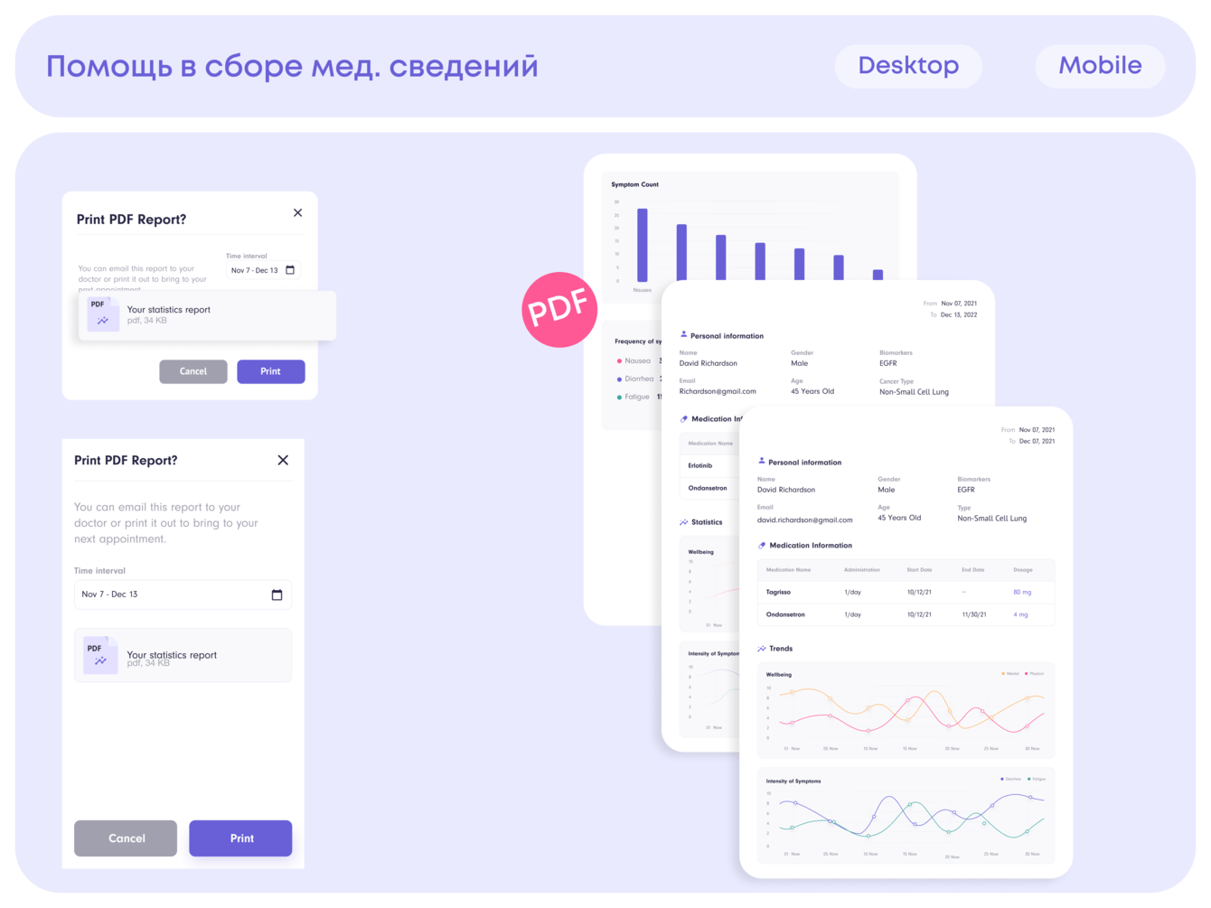 А чтобы сгенерировать PDF отчет, пользователю достаточно выбрать необходимый период времени. Графики дат строятся на frontend-е, PDF - документ формируется на backend-е и скачивается на устройство пациента.