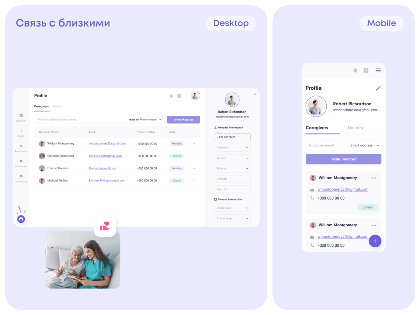 - Связь с близкими. Пациент может пригласить в учетную запись родных и делиться важной информацией.