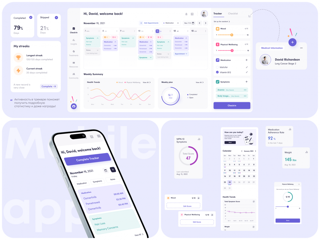 - Анализ изменений. С помощью трекера здоровья пользователи отмечают: ментальное и физическое состояние, изменения симптомов. Ежедневные данные добавляются в календарь. Пациент отслеживает состояние здоровья от недели к неделе.
