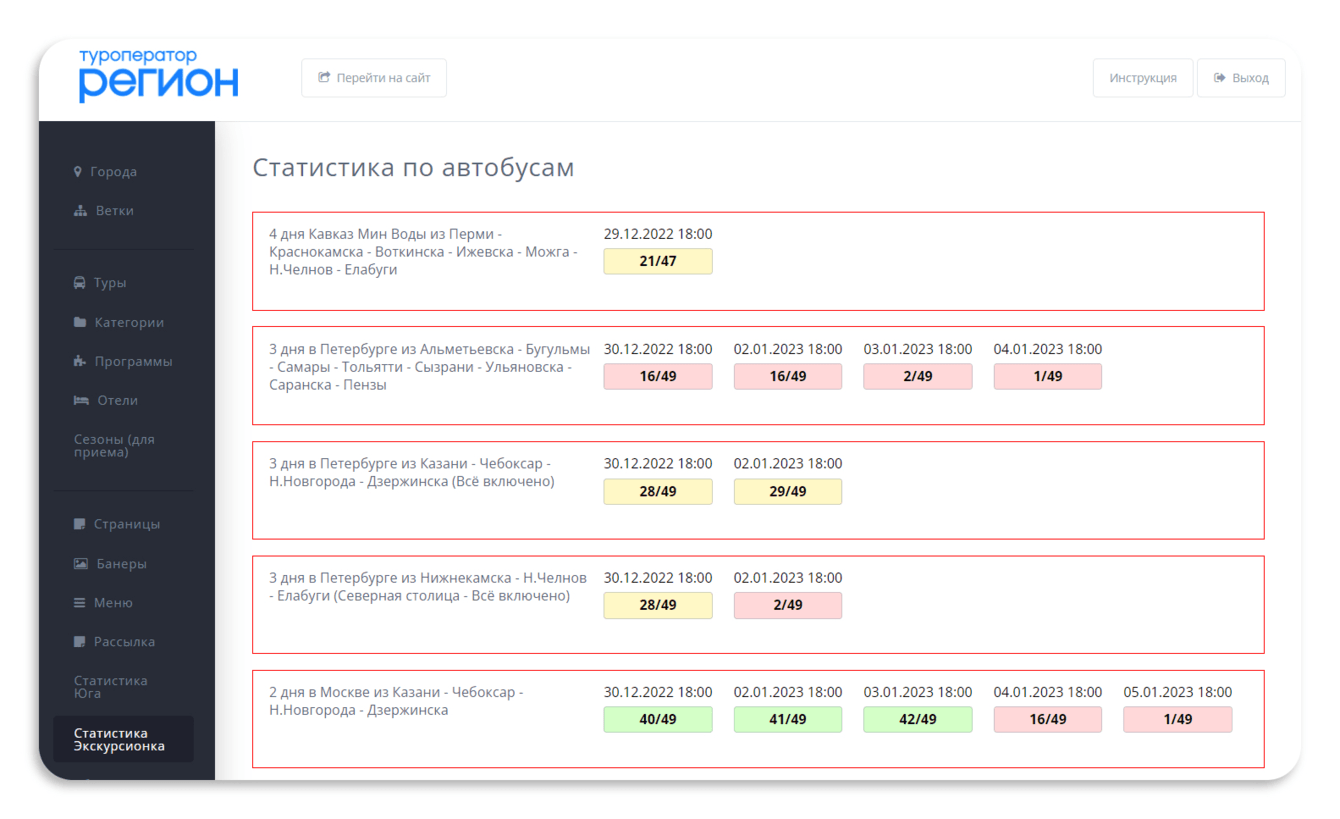 - Динамическое ценообразование. Мы сделали систему «светофор», которая всё это упрощает. Менеджер заходит в программу и все туры у него сгруппированы: красным цветом — туры с высокой загруженностью, на которые можно повышать цены, зелёным — с низкой, на которые цены надо опускать.Позже мы докрутили эту систему, чтобы она сама предлагала повышать или понижать стоимость.