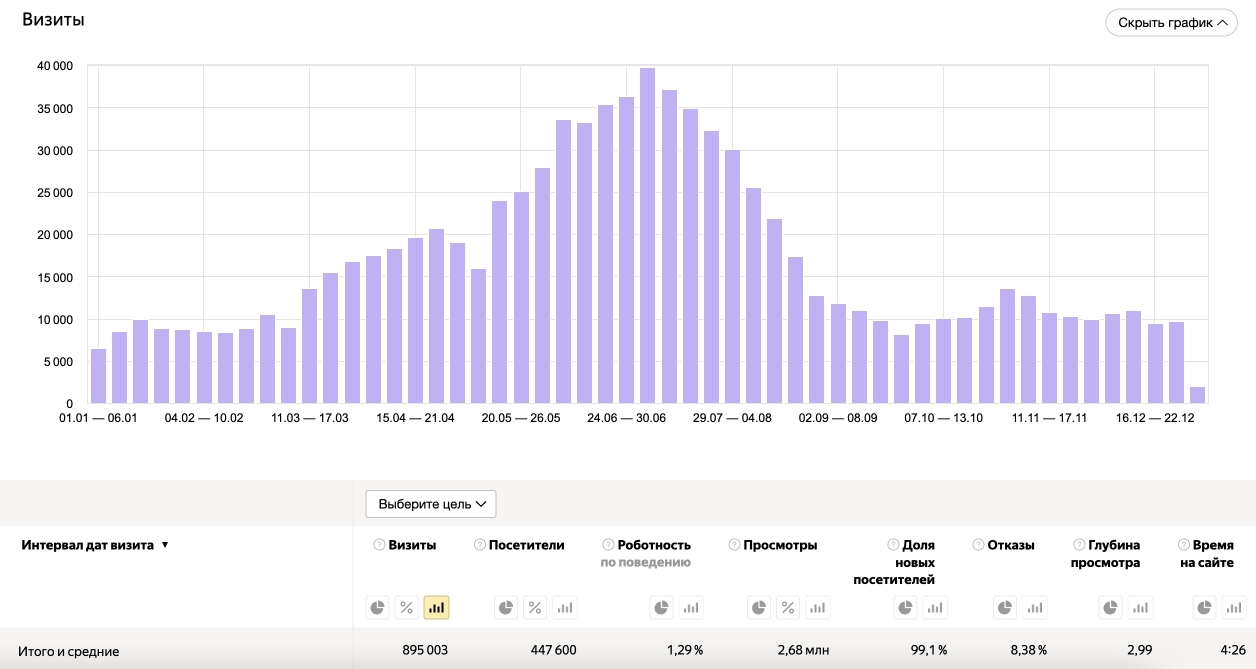 На фото график посещаемости в течение года из поиска. На сайт из поисковиков зашло почти полмиллиона человек