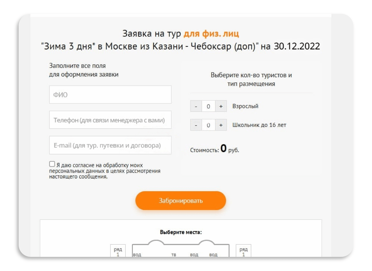 Многие туроператоры, в том числе “Регион”, использовали Мастер Тур от Мегатек для регистрации заявок, но в нем было проблематично зарегистрировать тур на физлицо. Нам надо было сделать так, чтобы физлица могли забронировать тур за 1,5–2 минуты. Для этого мы сделали небольшой модуль, который интегрировался с системой Мастер Тур — форму, которая передавала все данные по бронированию в систему.