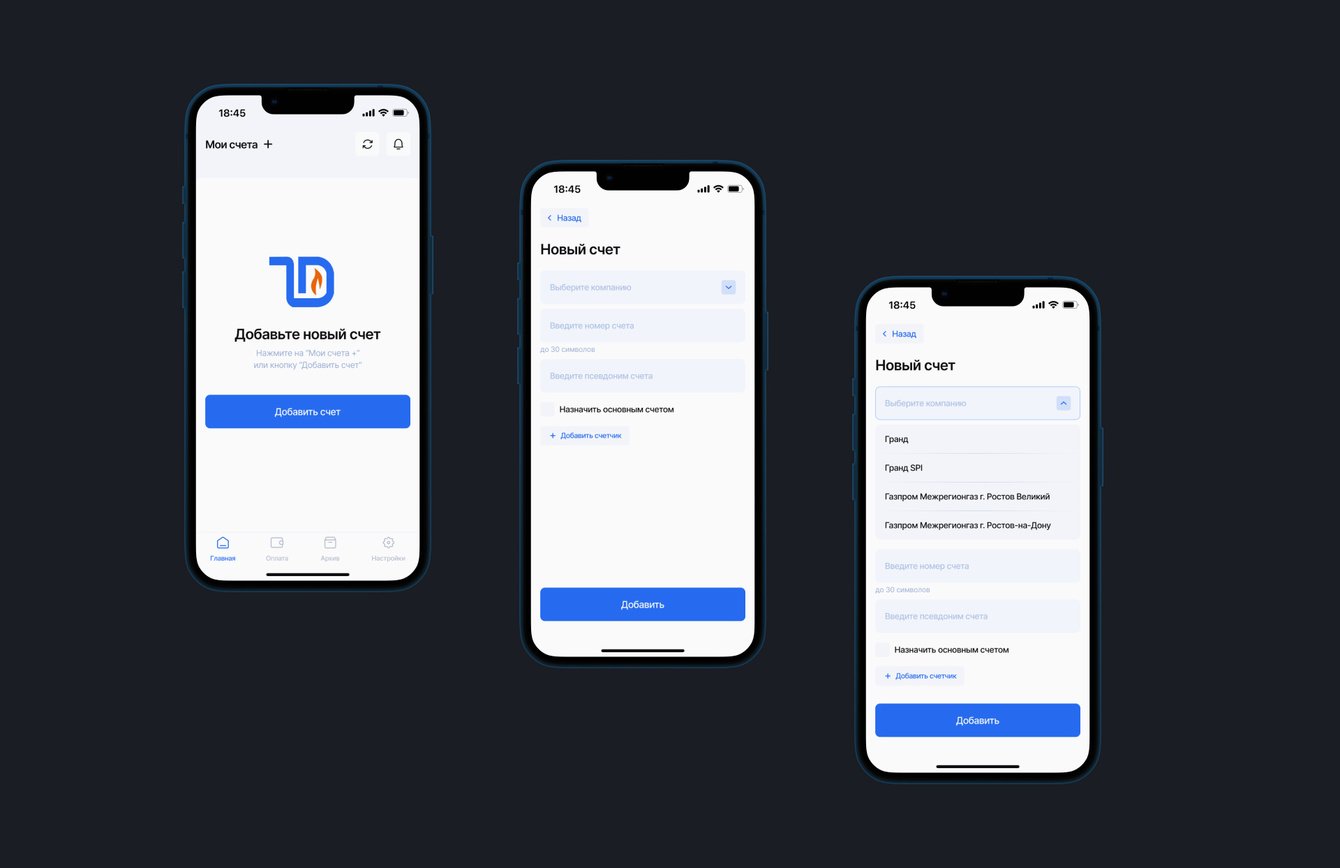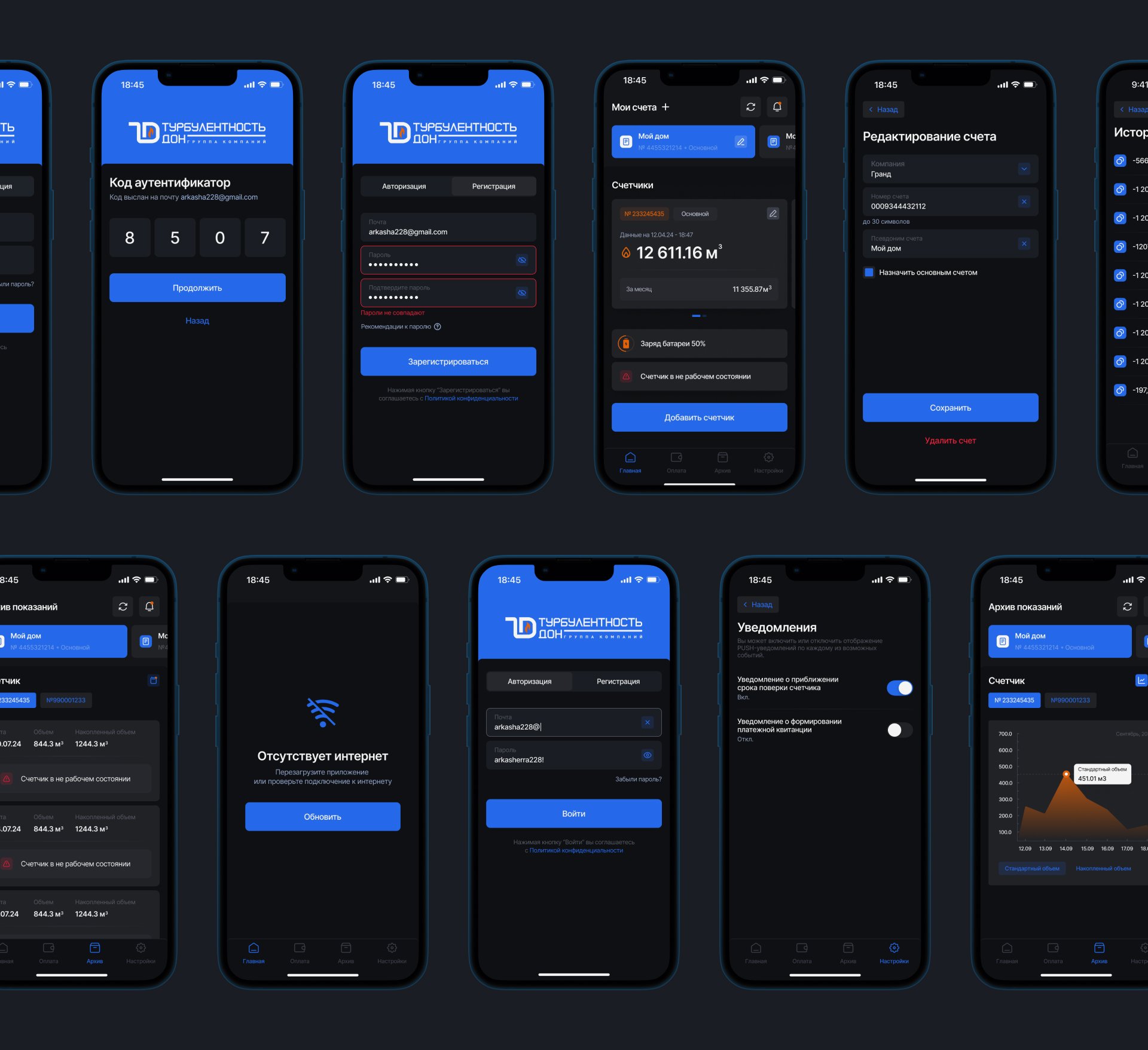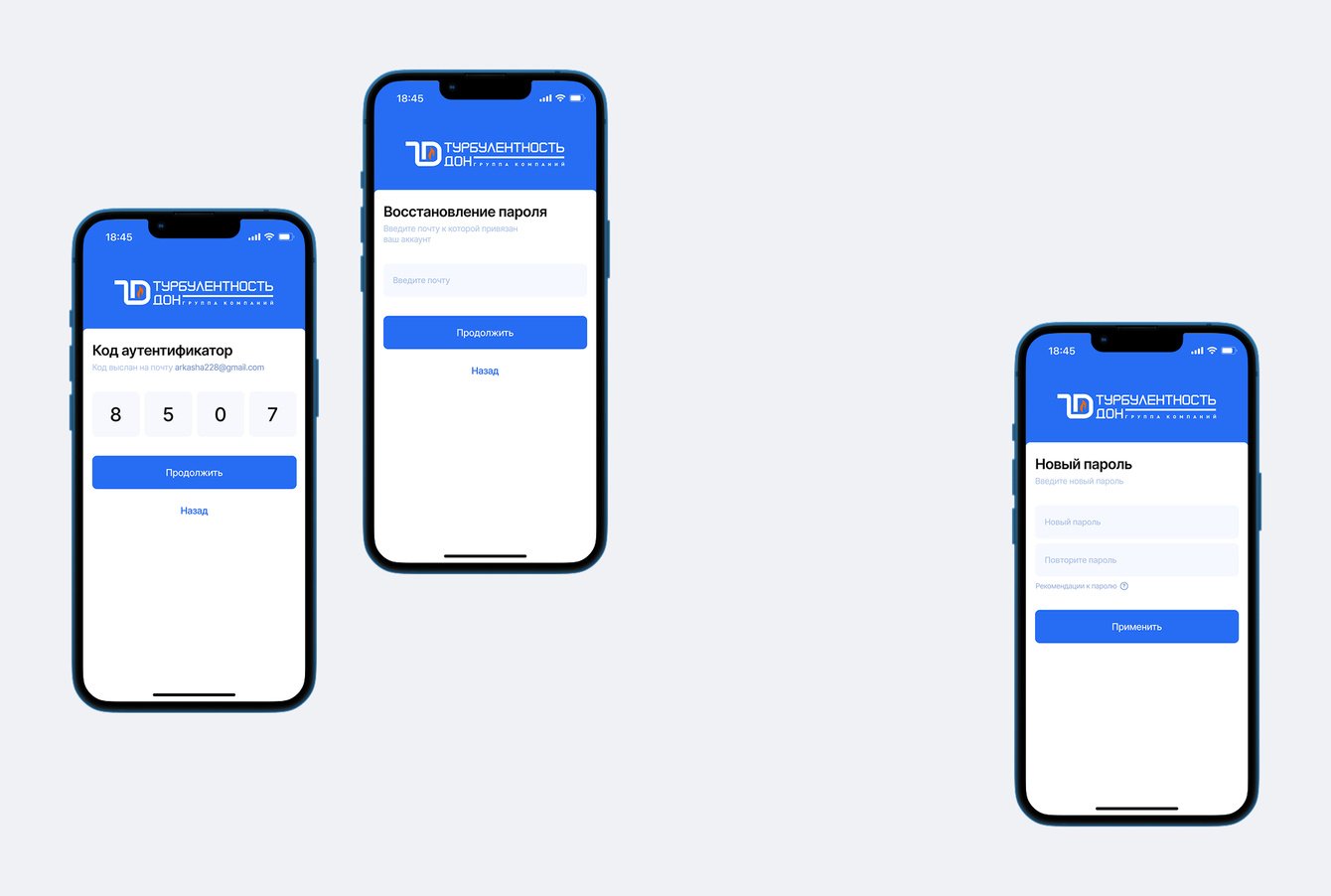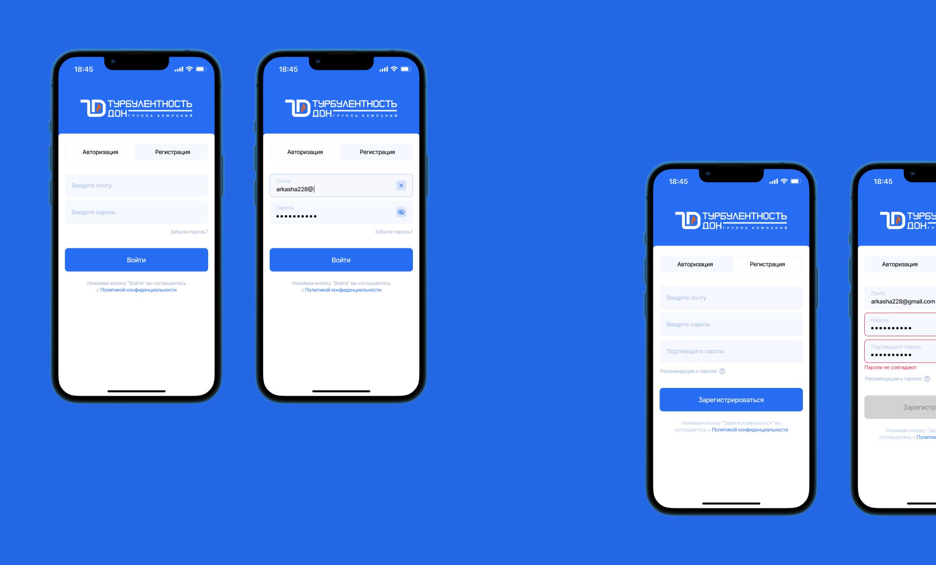 Макеты отрисовывали по брендбуку КГ «Турбулентность Дон», старались следовать логике процессов и сохранить легкость восприятия интерфейса для пользователя. С виду приложение вышло минималистичным и простым. Дизайн подготовили сразу в светлой и темной темах.