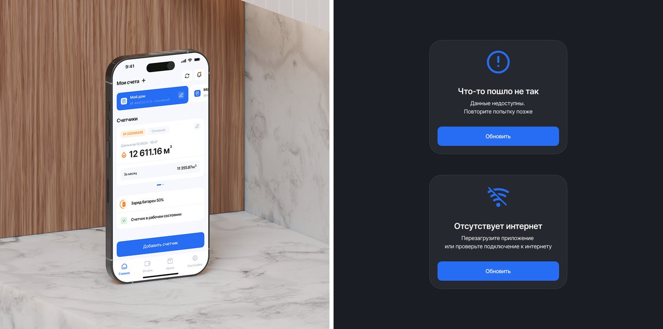 Пользователь проходит простую регистрацию и добавляет данные о поставщике услуг, лицевом счете и установленном оборудовании.