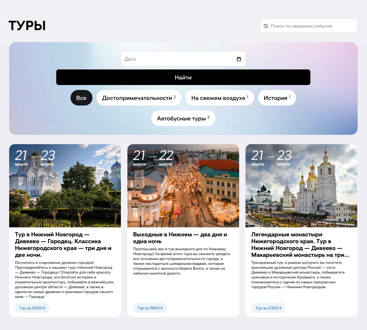 Два подробных каталога со списком доступных туров и экскурсий интегрированы с системой НижегородИнТур, поэтому все данные синхронизируются — на сайте только актуальные даты, свободные места и цены. Тур или экскурсию сразу легко забронировать.