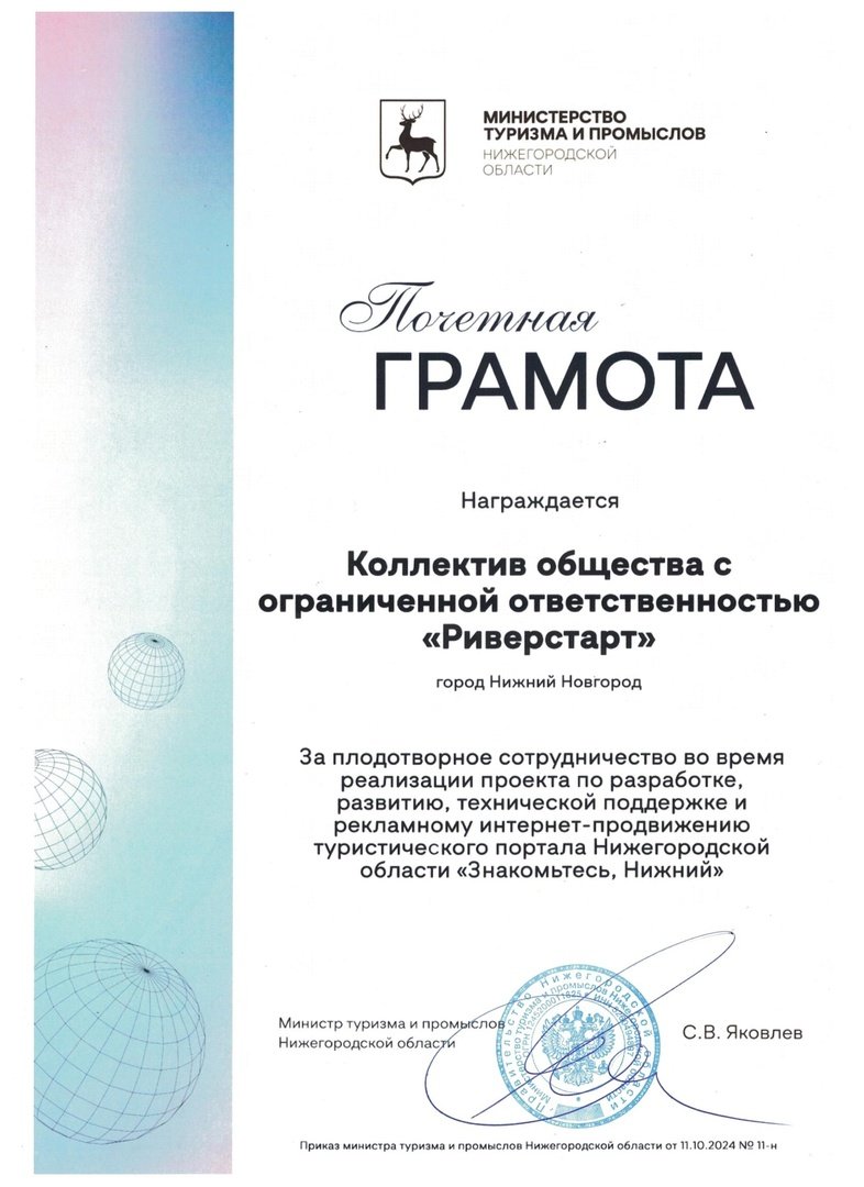 Коллектив ООО «Риверстарт» награждается за плодотворное сотрудничество по разработке, развитию, технической поддержке и рекламному интернет-продвижению туристического портала Нижегородской области «Знакомьтесь, Нижний».