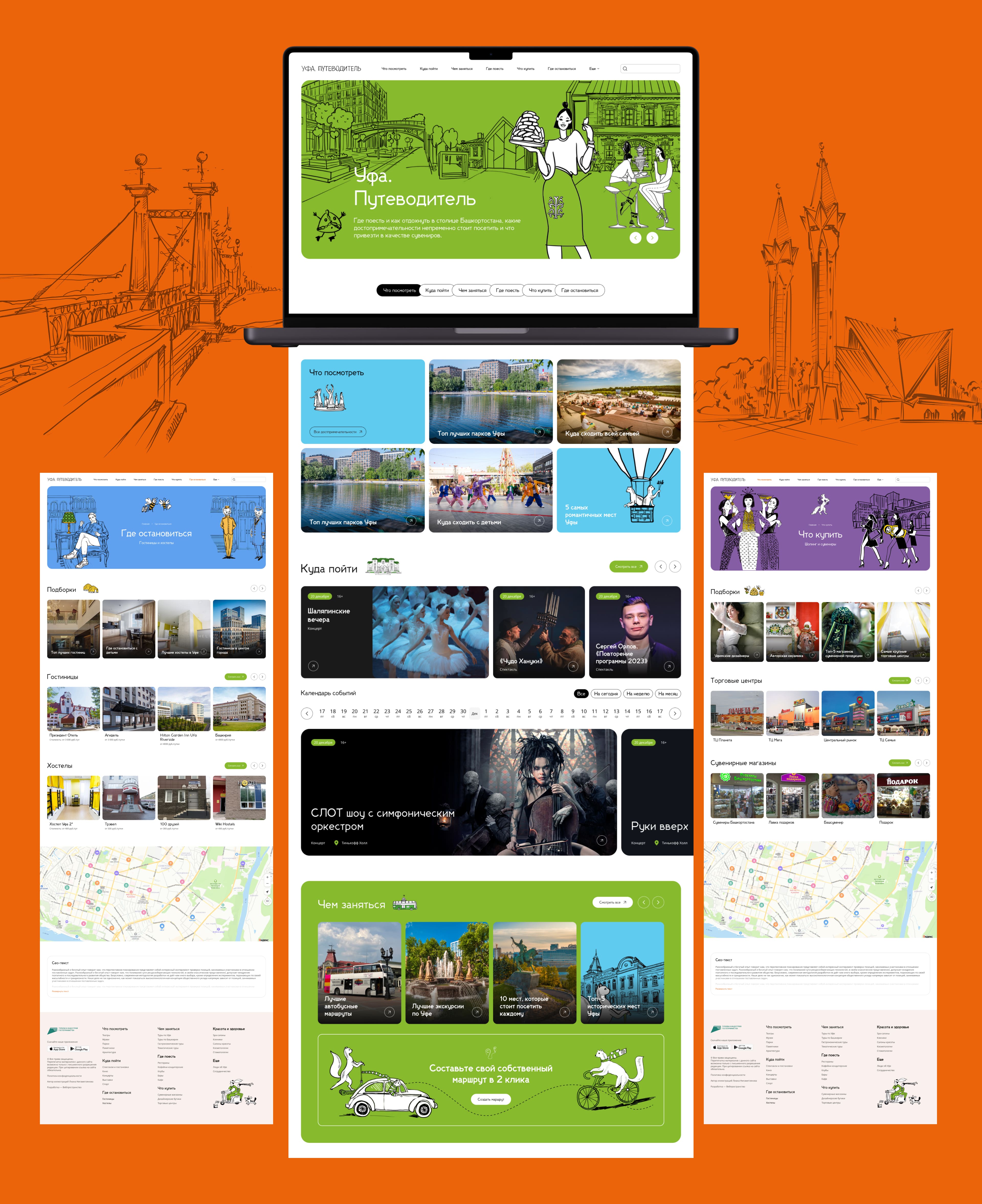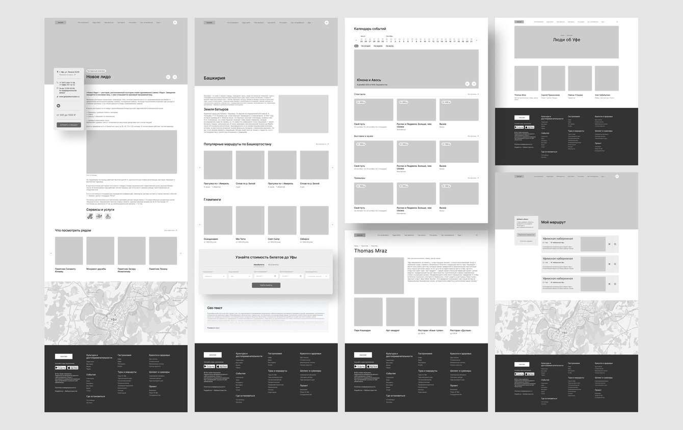 На основе согласованной структуры с учетом пожеланий клиента разработали детальный прототип всех страниц будущего портала, на которых показали расположение всех блоков и элементов. Хорошо проработанная структура и учет возможностей Заказчика позволила нам создать прототип удобного ресурса, который помогает туристам планировать свои поездки и получать максимум удовольствия от посещения Уфы.