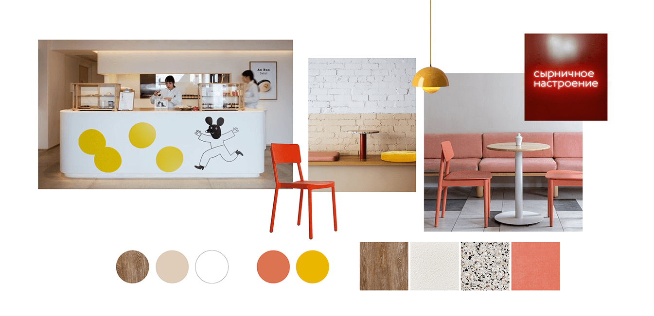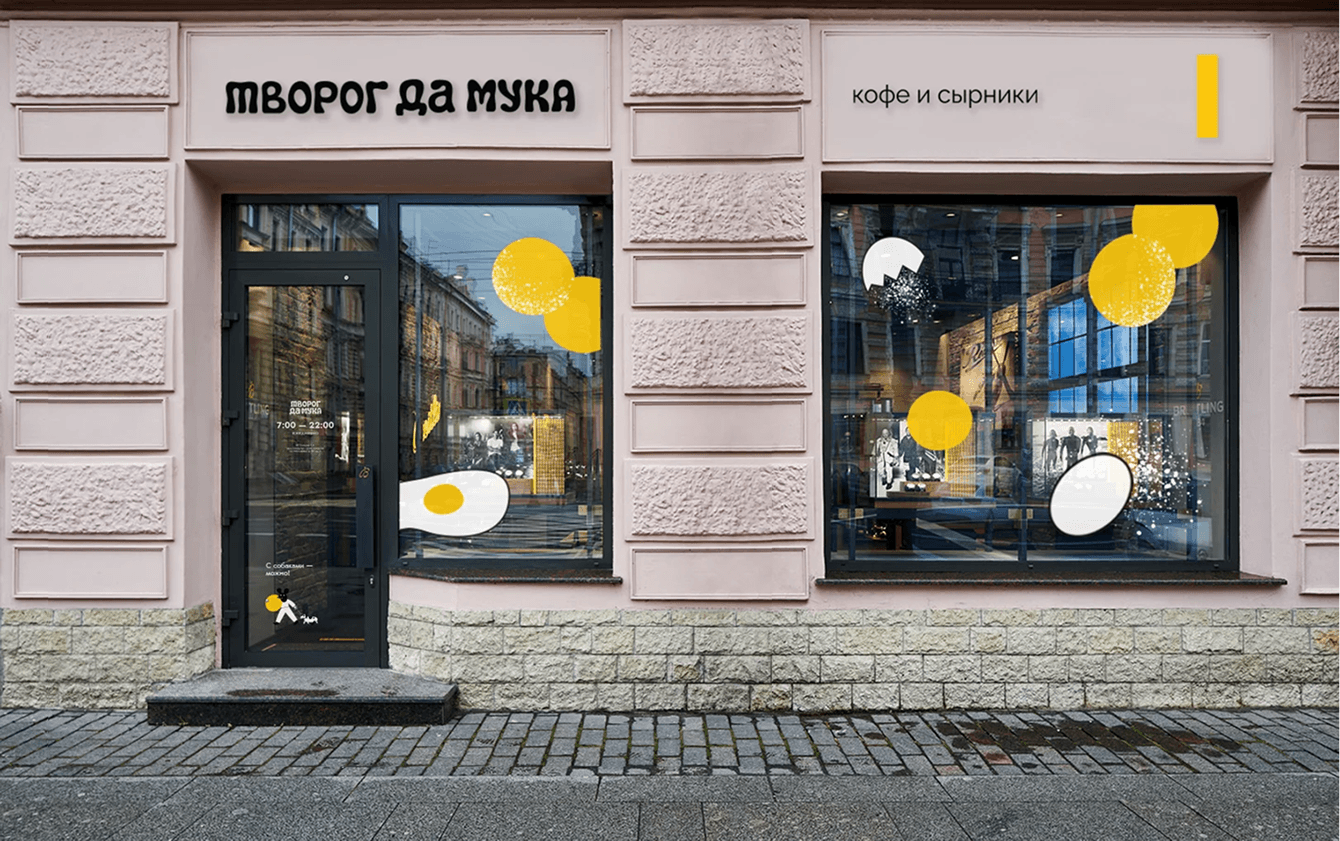 Два продукта хорошего качества — кофе и сырники. Формат заведения — быстрое обслуживание, возможность взять с собой, яркая упаковка, удобство выбора. Настроение — дружелюбное, тёплое, немного озорное.