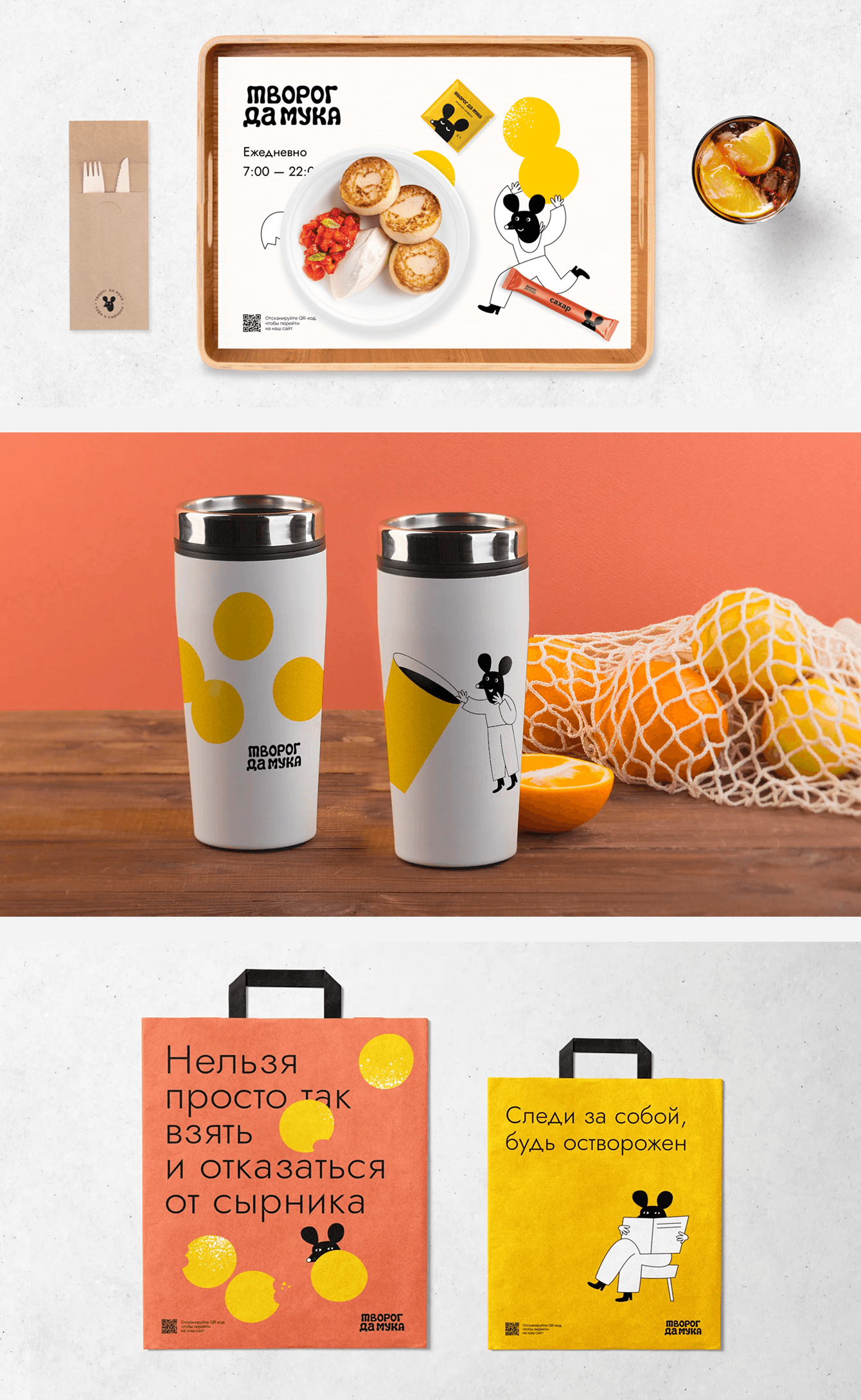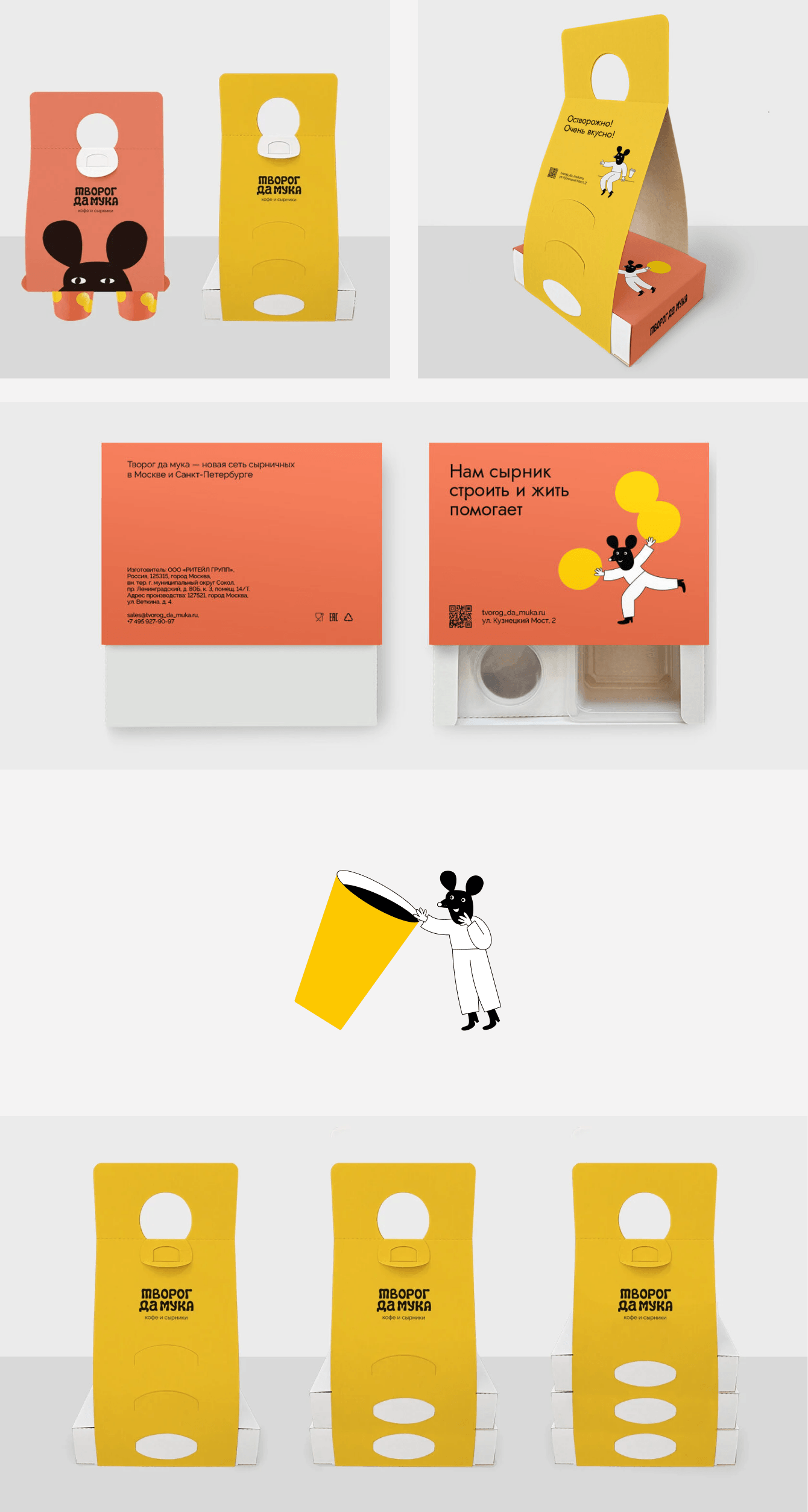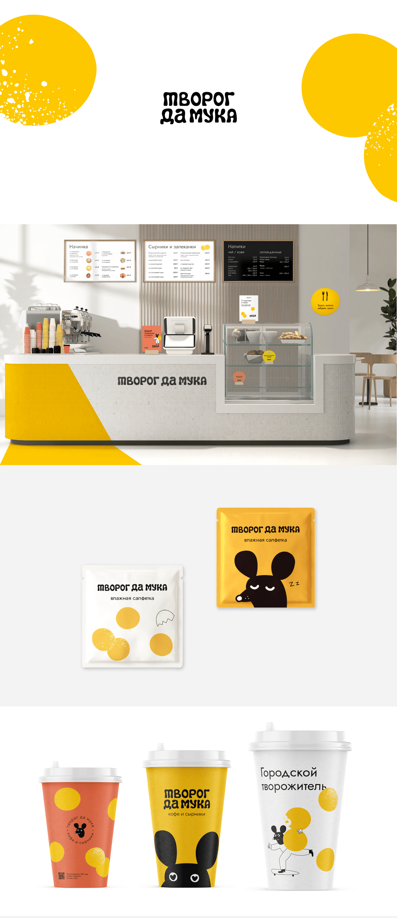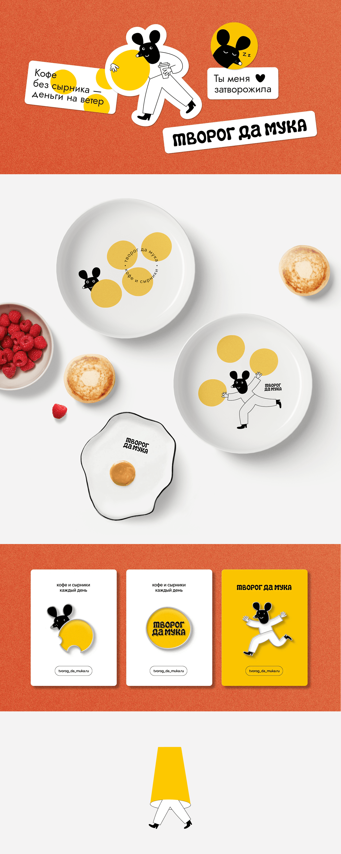 Фирменный стиль построен вокруг аппетитной жёлто-персиковой палитры, образа сырников и фирменного персонажа — забавного мышонка. Главный визуальный элемент — жёлтые кружки-сырники, разбросанные по макетам, с эффектом муки и аппетитной текстурой. Дополняют стиль иллюстрации яиц и мелкие детали: крошки, брызги, лёгкий творожный беспорядок.