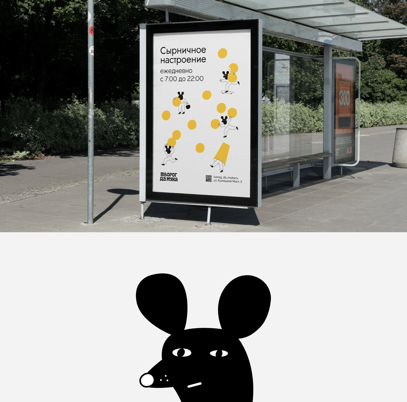 Мышонок — это эмоциональный якорь бренда. Он не просто украшение, а активный участник визуальной коммуникации. Может выглядывать из-за витрины, хватать сырники, смеяться, строить рожицы — и тем самым оживлять макеты.