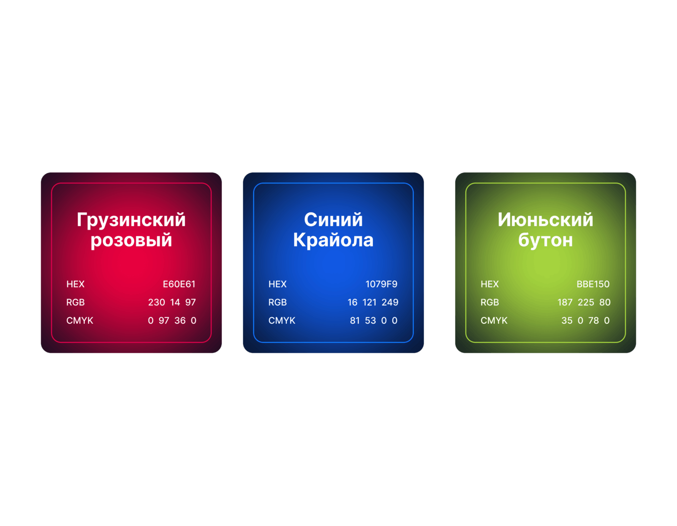 Проблему излишнего акцента на формах и строгости решили при помощи использования 4 дополнительных цветов в виде “деконструированного градиента”, который перетекает в полноценный градиент лишь в фирменном стиле.