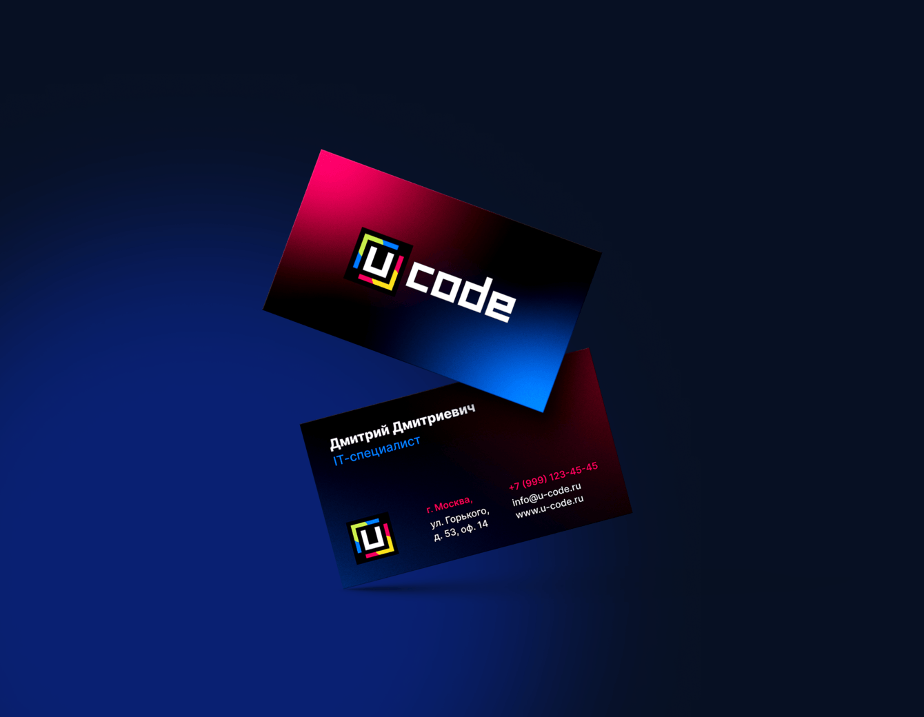 Для отражения строгости и минимализма бренда U-code было принято решение использовать прямые углы во всех элементах логотипа, как для упрощенной версии (без “code”) так и для полноценного логотипа.