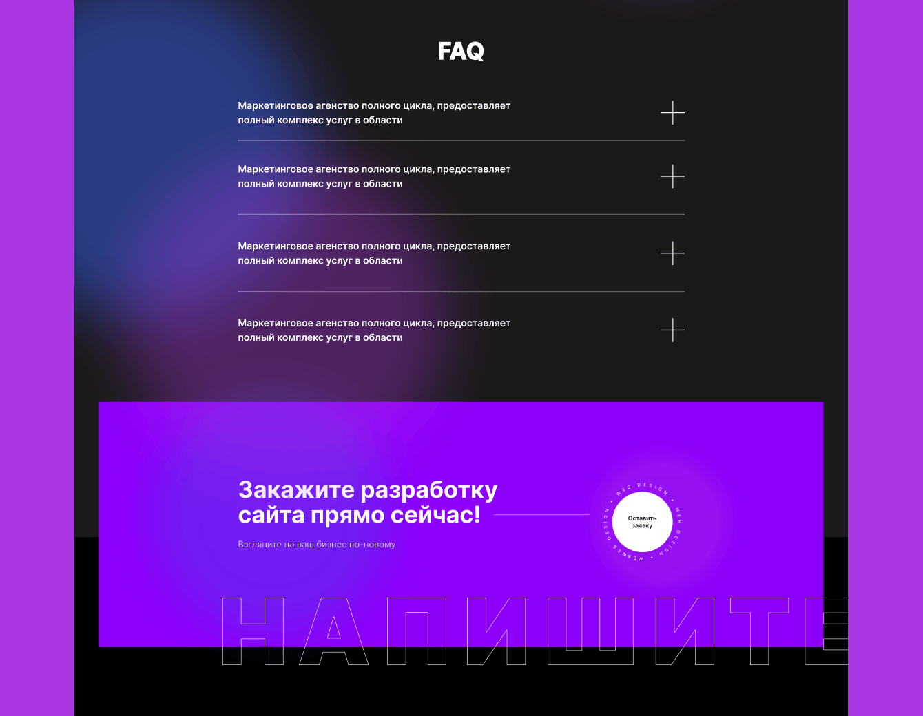 - Создание концепции дизайна: На основе требований заказчика и анализа конкурентов, была создана концепция дизайна, которая была представлена заказчику для утверждения. Концепция дизайна включала в себя цветовую гамму, шрифты, структуру и расположение элементов на сайте. При создании сайта использовали цвет, не использующийся в брендбуке, что вполне уместно в данном стиле - яркие, неоновые цветах различных оттенков.