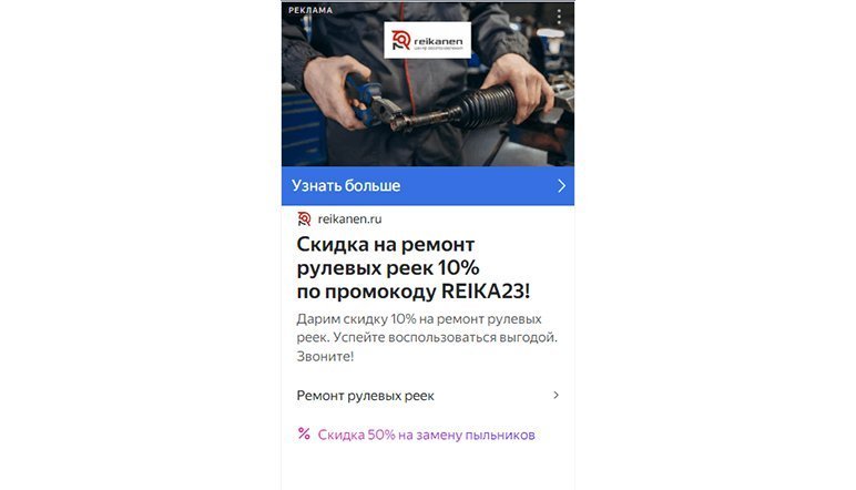 Базе мы показывали не просто объявления, а объявления со специально разработанной акцией, которую мы продумали совместными усилиями с клиентом. Пример акционного объявления: