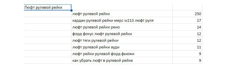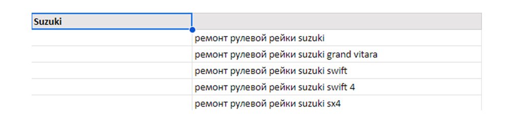 Сначала был сбор семантики, и сбор этот был основательным. Мы собрали около 1500 ключей, которые разбили на группы. Пример семантики для группы Ремонт рулевых реек_Suzuki: