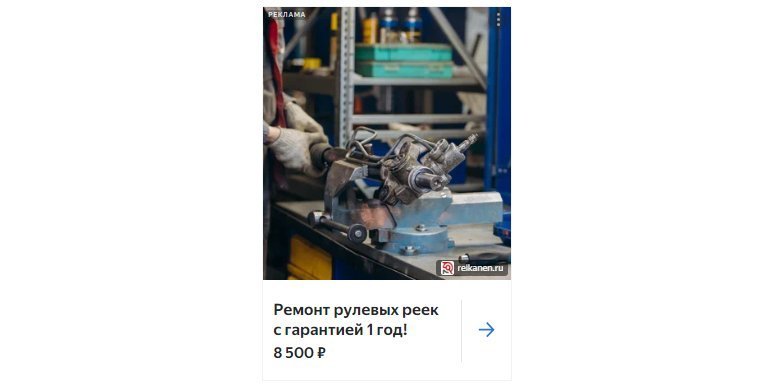 Теперь с помощью фида можно продвигать не только товары, но и услуги. После того, как мы создали фид с услугами, собрали рекламные кампании со смарт-баннерами. Можно было создать и Товарные кампании, но у нас уже есть 5 Мастеров Кампаний, которых вполне достаточно. Пример объявления из кампании со смарт-баннерами по услугам: