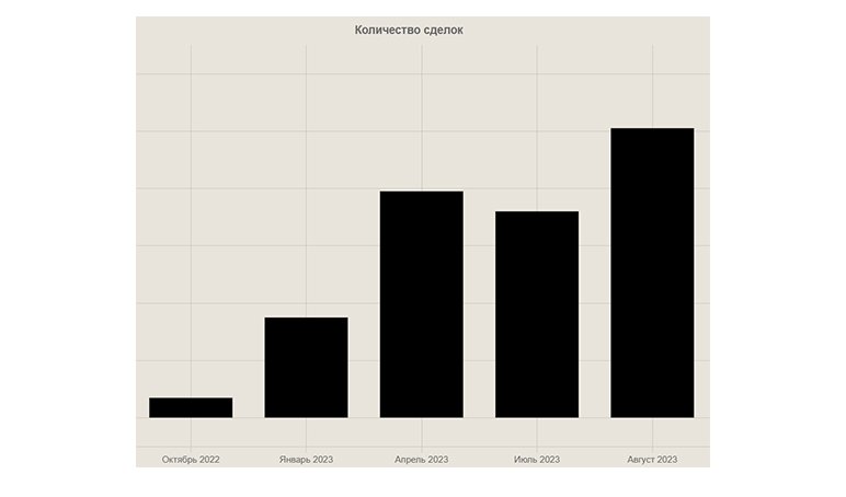 В июле немного “просели”, но в августе всё наверстали. В целом количество сделок в августе примерно на 95 раз больше, чем в октябре, и примерно на 20 больше, чем в апреле 2023. Динамика выигранных сделок: