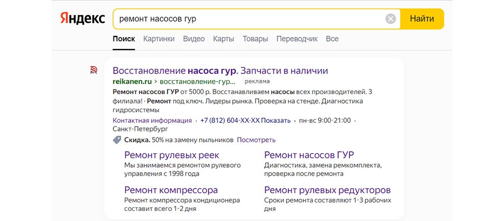 В результате мы собрали 2 поисковые кампании - на СПБ и Н. Новгород, которые и сейчас приносят большую часть конверсий. Позднее - выделили в отдельные кампании запросы по услуге, по которой требовалось получить еще больше обращений. Итог - 4 поисковых кампании, объявления из которых “висят” в топе выдачи Яндекса. Пример рекламного объявления в выдаче поисковика: