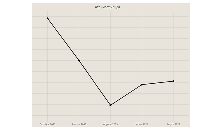 Конечно, вы можете резонно возразить, что количество лидов может увеличиться благодаря банальному увеличению бюджета, поэтому демонстрируем динамику стоимости лида.