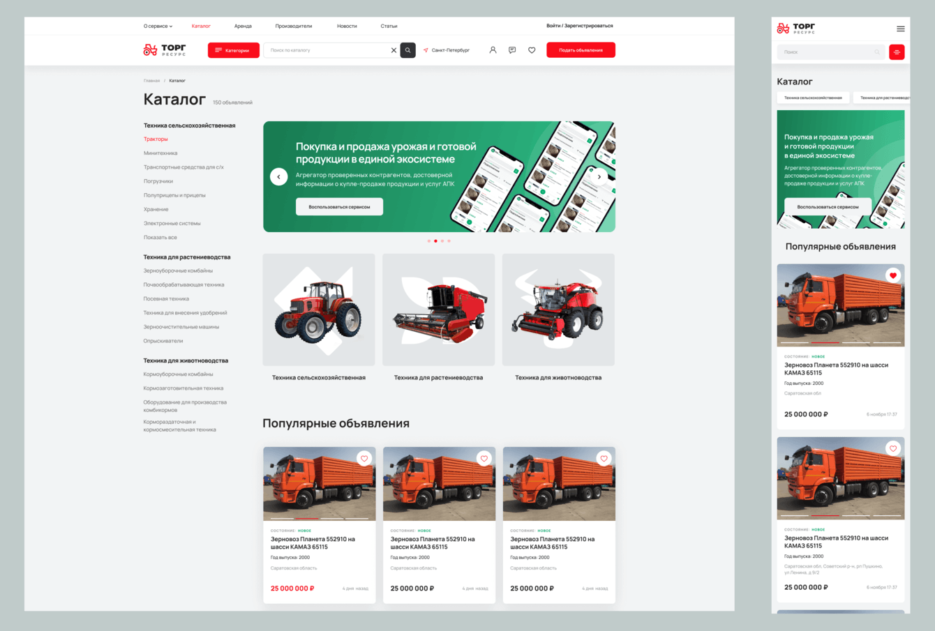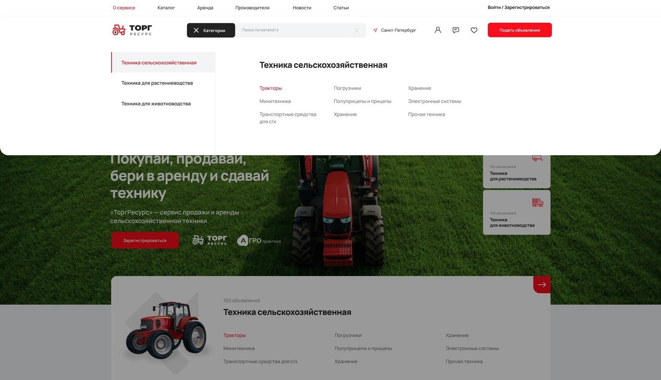 Мы уже разрабатывали с заказчиком экосистему для агробизнеса - АГРОпрактика, когда у заказчика появился большой интерес к рынку сельскохозяйственной техники (в 2021 году рынок вырос на 46%, по данным Агроинвестора, потребность в шеринге техники тоже росла). В рамках общих категорий по СХ-продукции было сложно отобразить преимущества и логику, тогда было принято решение использовать наработки и сделать самостоятельный сервис по продаже и аренде сельскохозяйственной техники. Кейс про то, как мы делали АГРОпрактику, можно прочитать здесь.