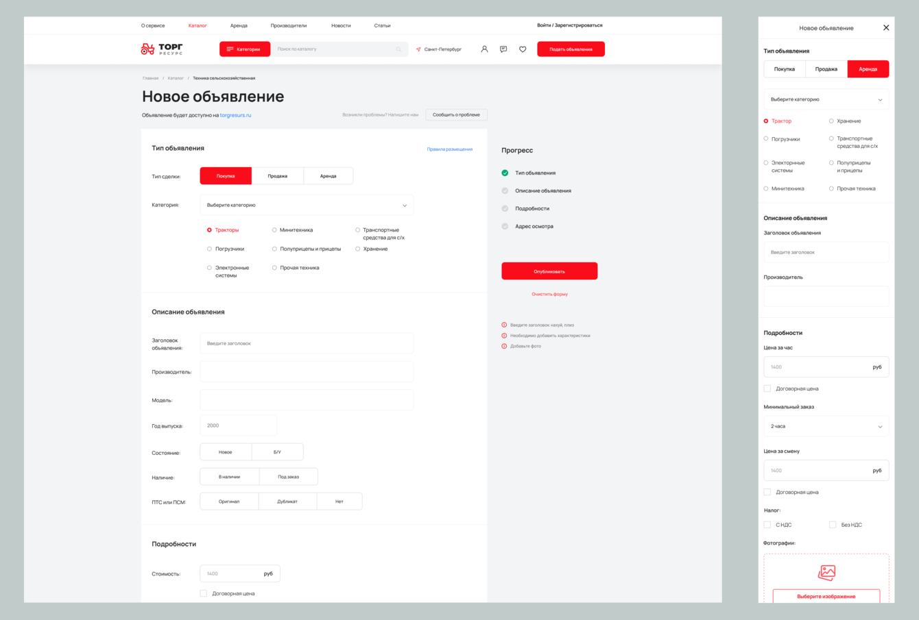 В форме подачи в самом начале мы уточняем направление, в зависимости от выбора "продажа" или "аренда" меняется набор полей. В форме используем валидацию на фронте и бекенде, а также прогрессбар, который подсказывает путь пользователю. В валидации продумана система ошибок по каждому полю. Не заполнено более трех пунктов - выдаем требование заполнить объявлении, если менее трех - показываем конкретные поля и перебрасываем якорем к необходимому блоку.