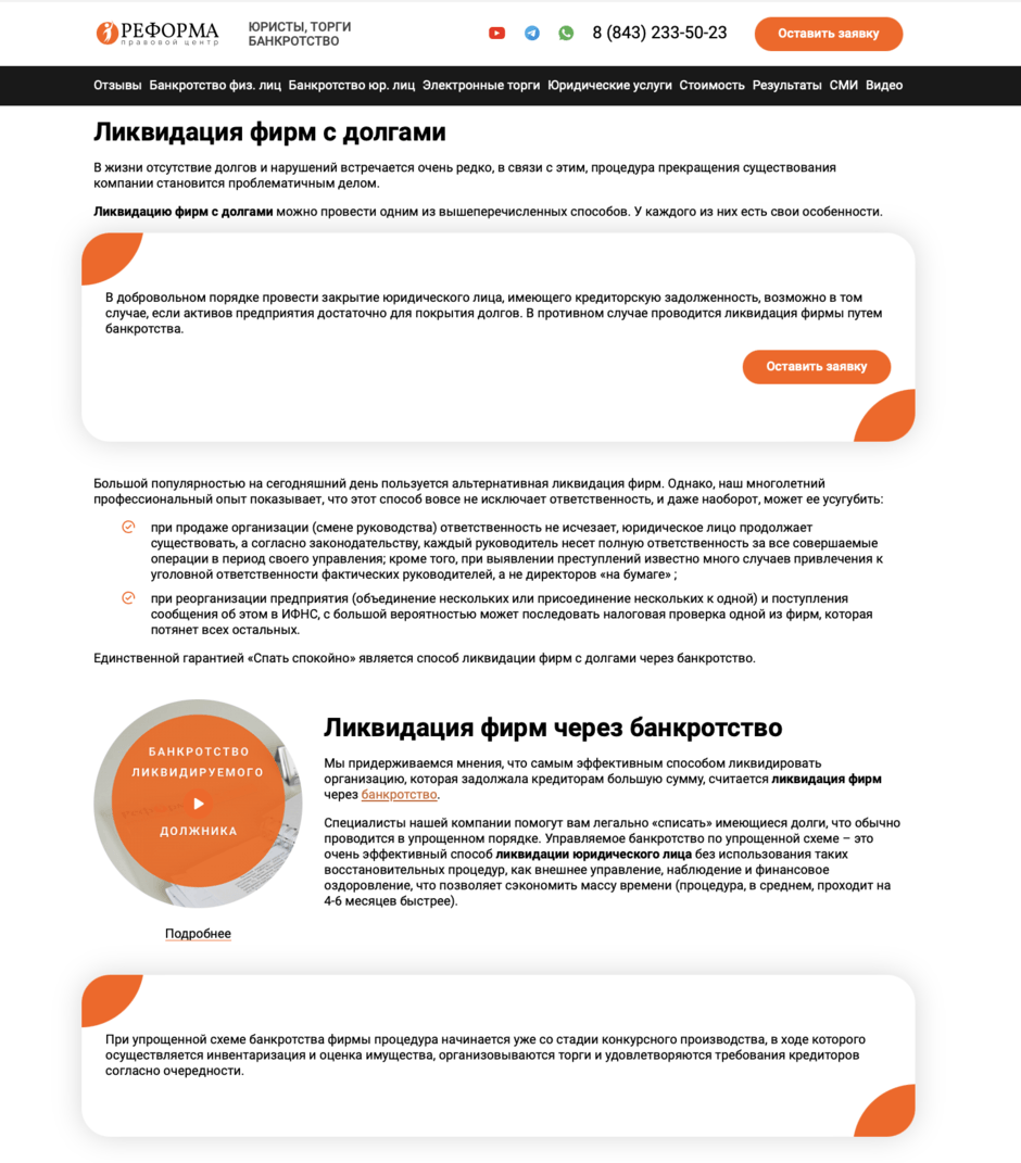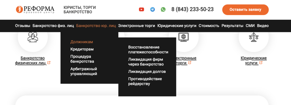 В шапку сайта мы поместили контакты и кнопки, ведущие на страницы услуг компании. Чтобы соблюсти четкую структуру, мы классифицировали все услуги и подуслуги. Так, раздел «Банкротство юр. лиц» содержит среди прочих раздел «Должникам», а раздел «Должникам» содержит еще несколько услуг. У каждой услуги – своя страница.