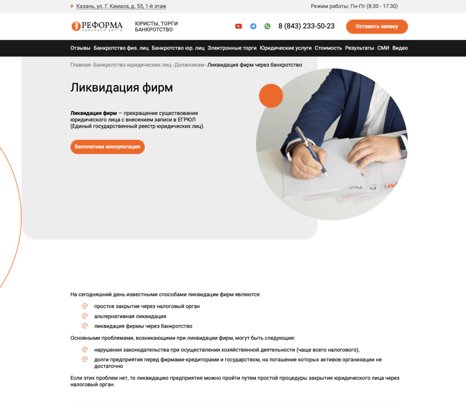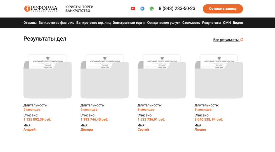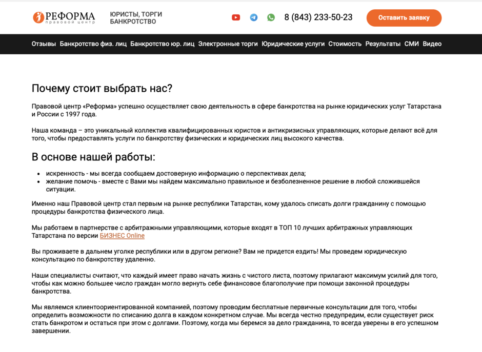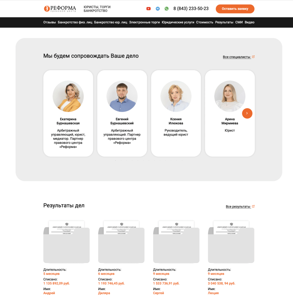 Клиент – Правовой центр «Реформа». Занимается банкротством физических и юридических лиц, разработкой стратегий, арбитражным управлением и прогнозированием. Это сложные и дорогие услуги, продать которые не так просто. Важно заслужить доверие граждан, большинство из которых уже погрязли в проблемах, устали и напуганы. Получается, что мы не просто разрабатываем сайт, но и выступаем в роли некоего психолога!