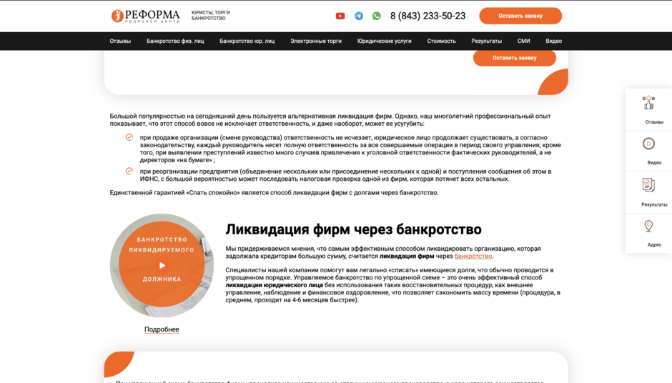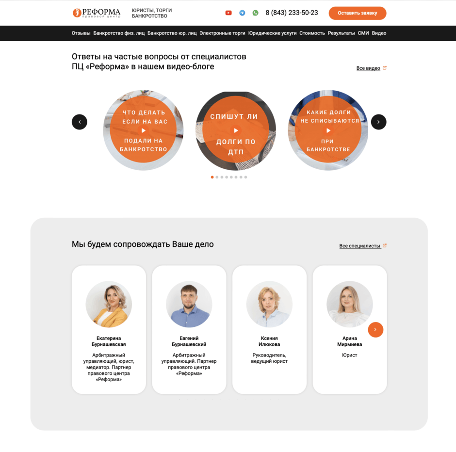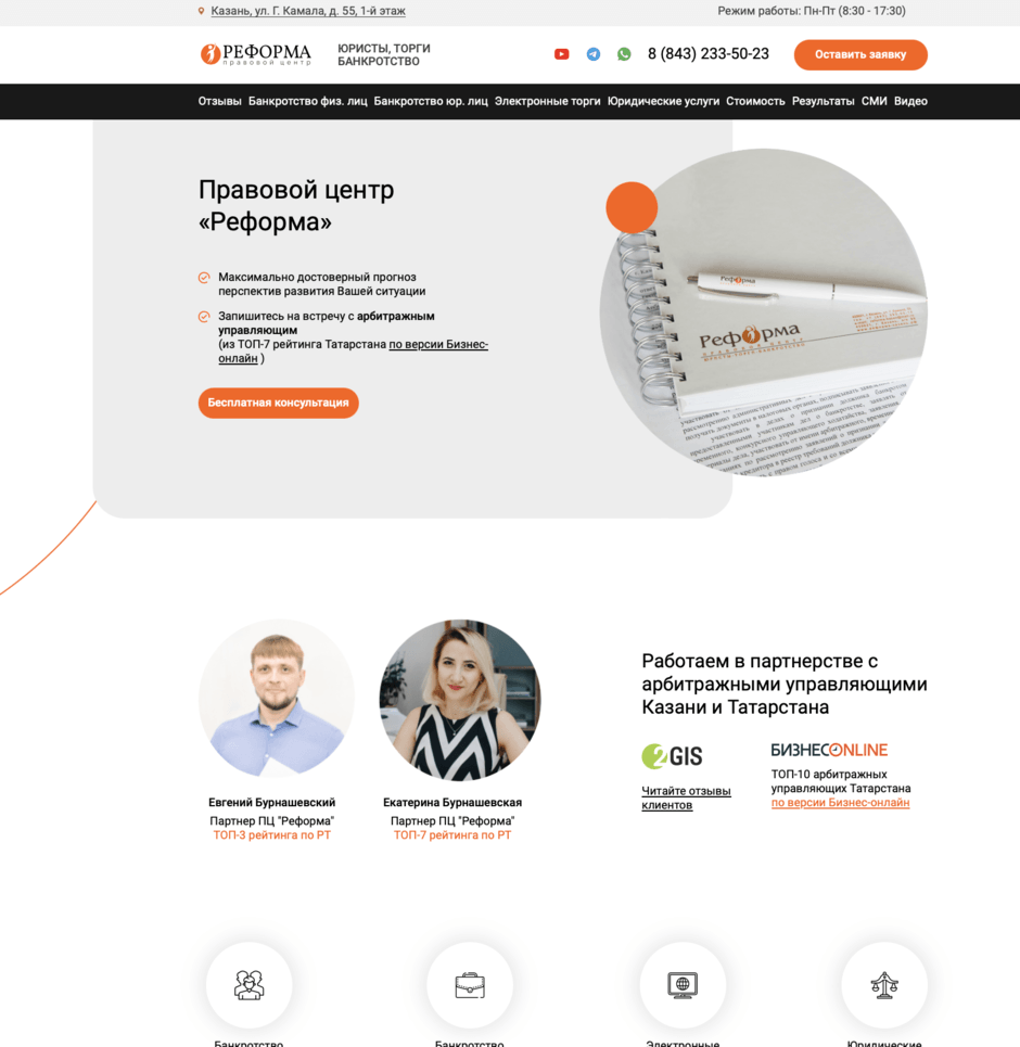 Клиент – Правовой центр «Реформа». Занимается банкротством физических и юридических лиц, разработкой стратегий, арбитражным управлением и прогнозированием. Это сложные и дорогие услуги, продать которые не так просто. Важно заслужить доверие граждан, большинство из которых уже погрязли в проблемах, устали и напуганы. Получается, что мы не просто разрабатываем сайт, но и выступаем в роли некоего психолога!