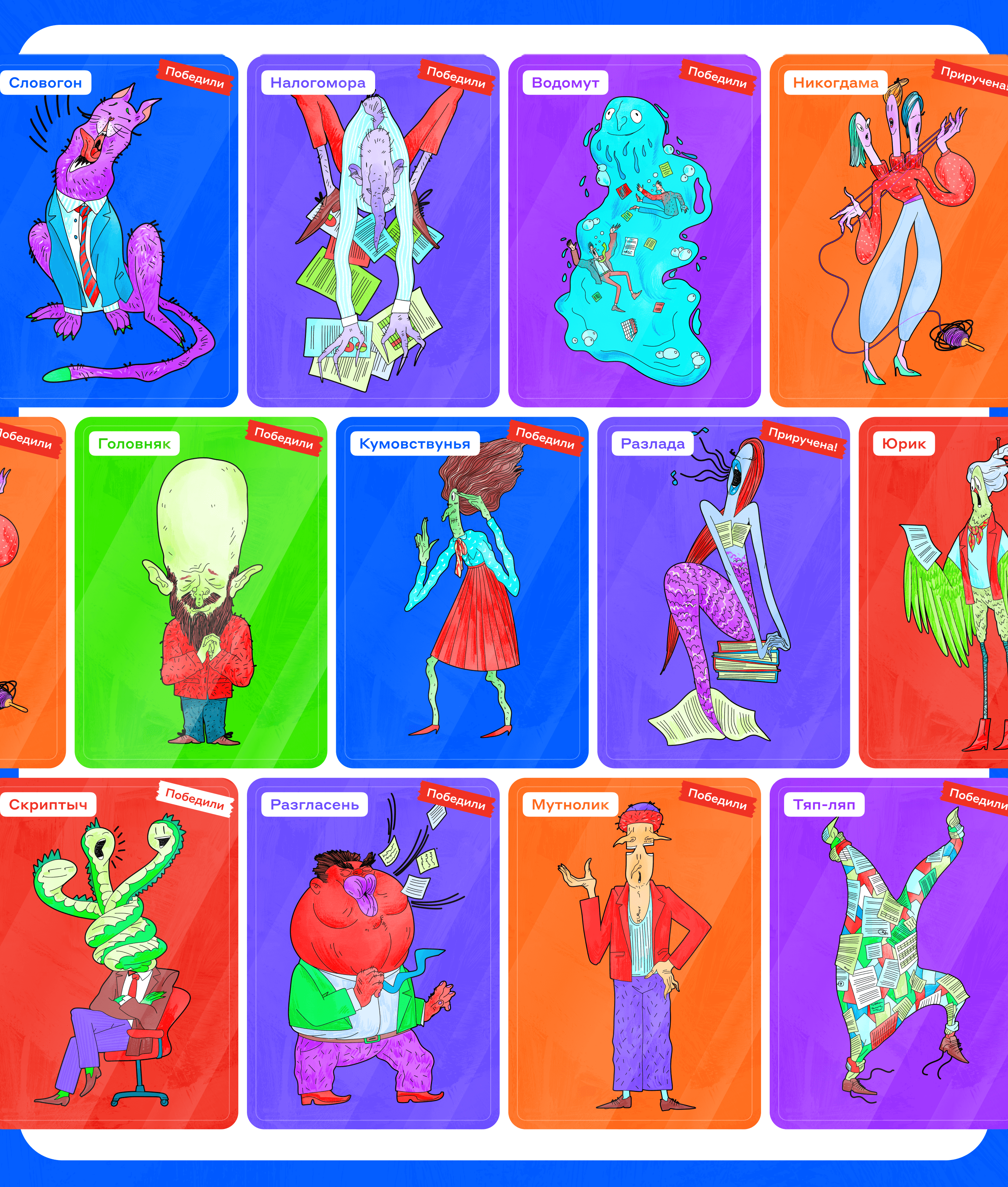 Словогон. Кот в официальном костюме, который проникает на встречи в офисе и одурманивает персонажей так, чтобы никакой проект не сдвинулся с места, и все бесконечно его обсуждали и накидывали идеи, вместо того чтобы уже приступить к делу
