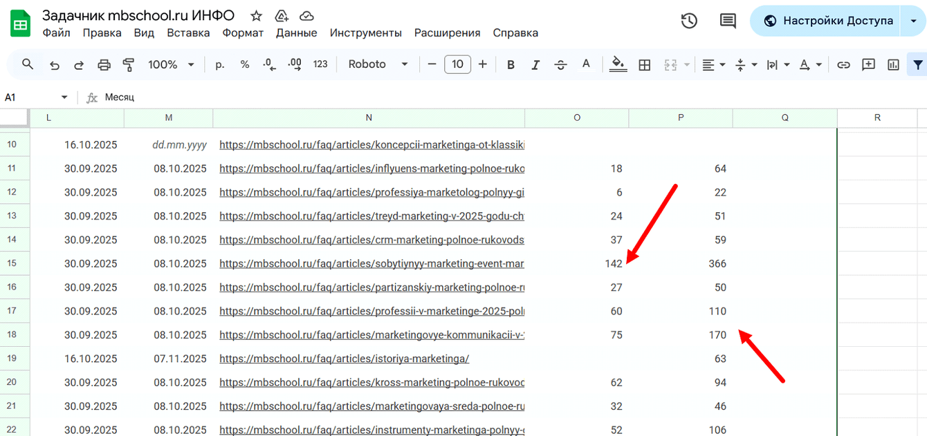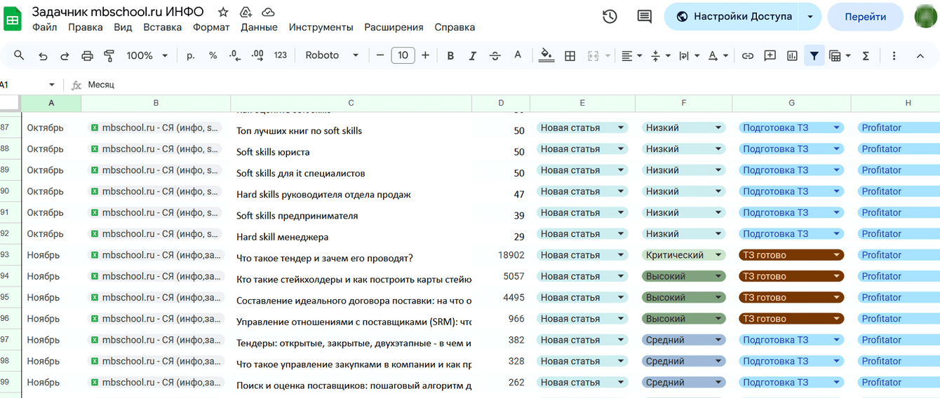 Этот документ стал источником истины и для команды, и для заказчика, практически полностью автоматизировав рутинные согласования. Клиент размещает готовые материалы, данные по трафику заносятся в задачник для оценки эффективности каждой статьи.