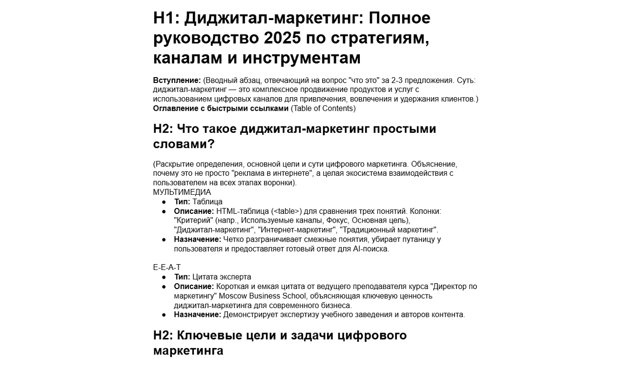 Мы внедрили двухуровневый процесс создания статей с помощью ИИ: для высокоприоритетных (ВЧ) запросов нейросеть создавала подробную структуру для последующей глубокой доработки редактором. Вот ее отрывок: